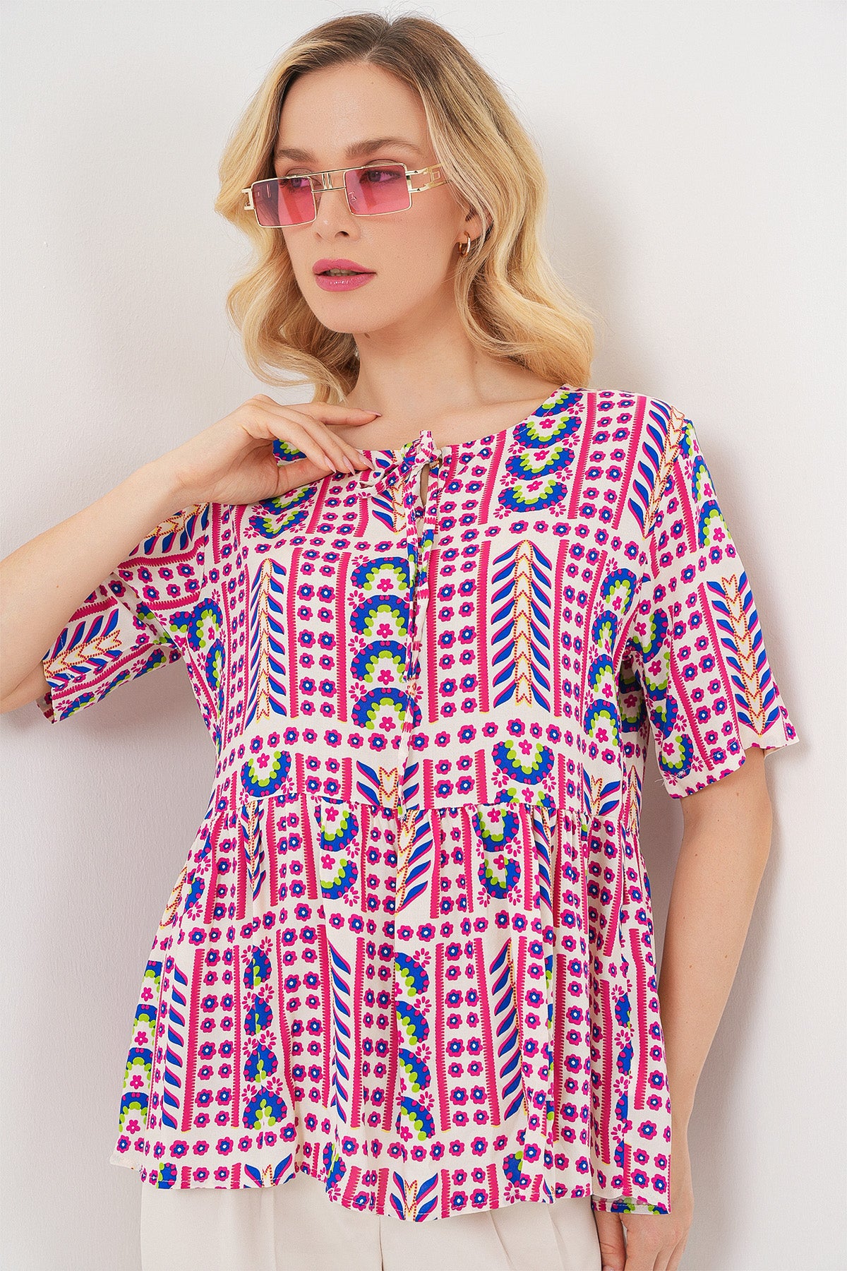BGD Women Women's Patterned Short Sleeve Blouse 969 - Fuchsia - Prescott