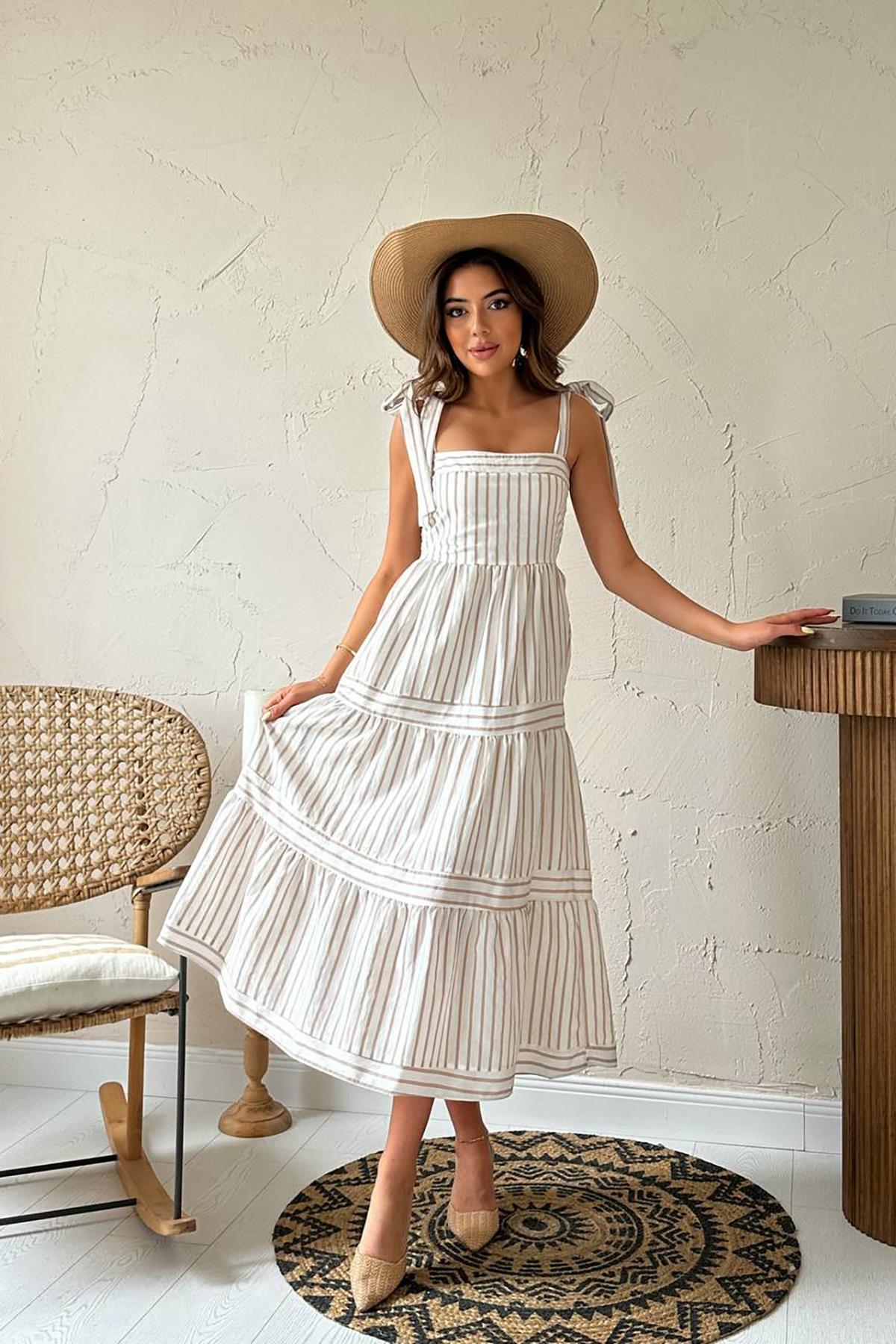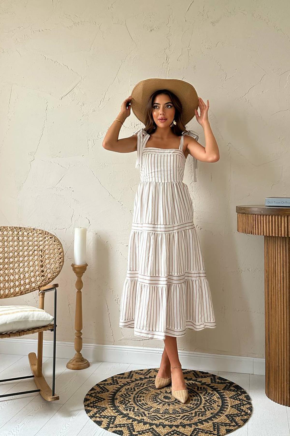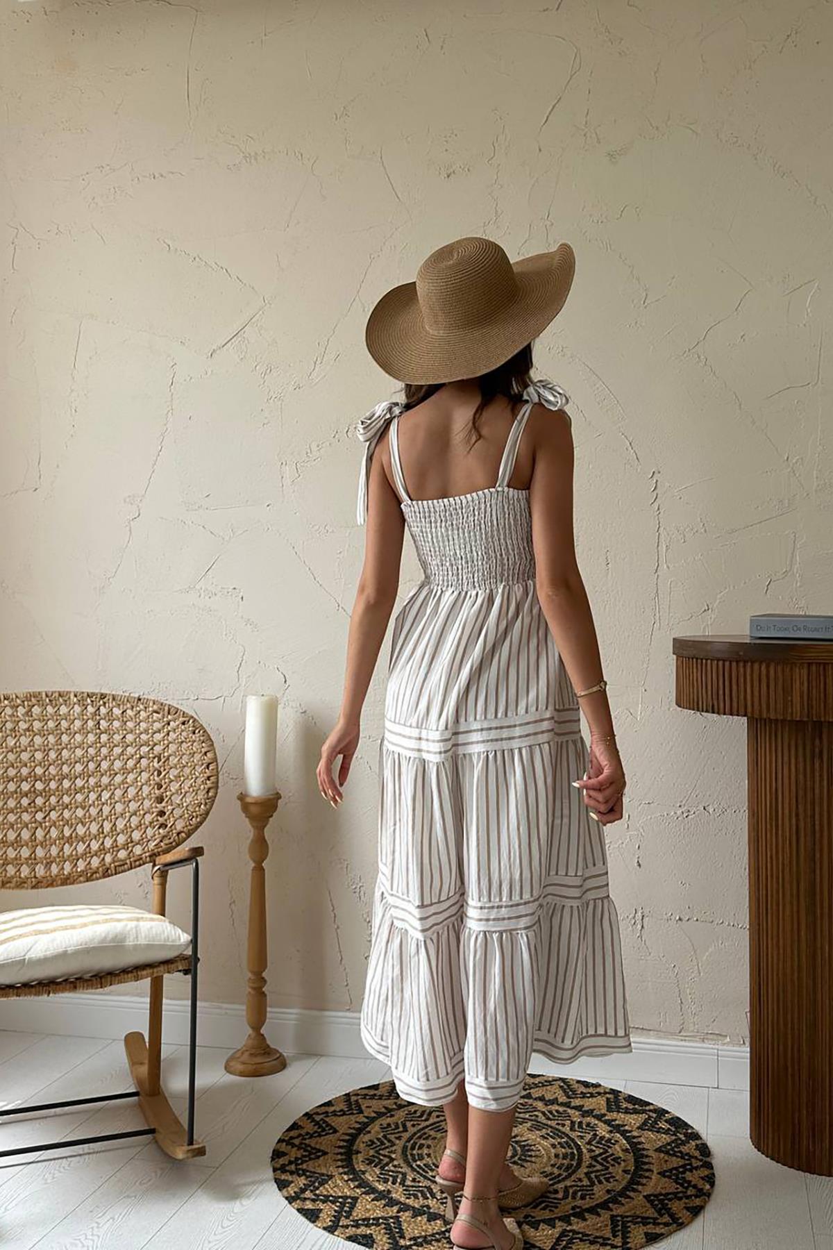 ELS Toptan Bej Omuzdan Bağlamalı Çizgili Elbise - Lucan