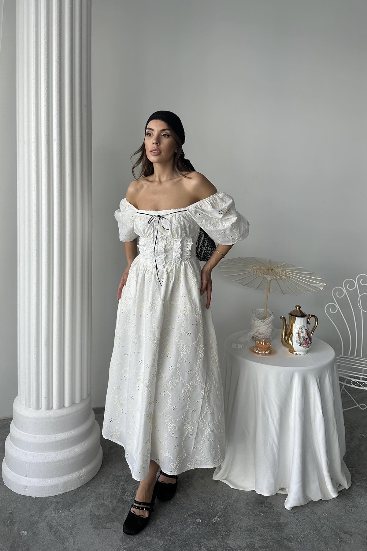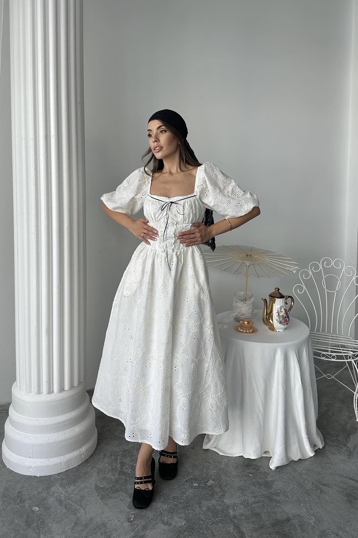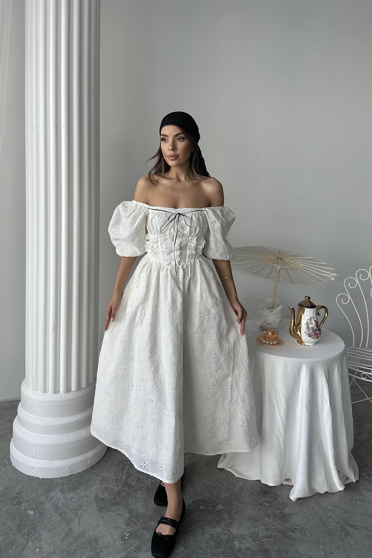 Toptan Ekru Dantel Detaylı Brode Elbise