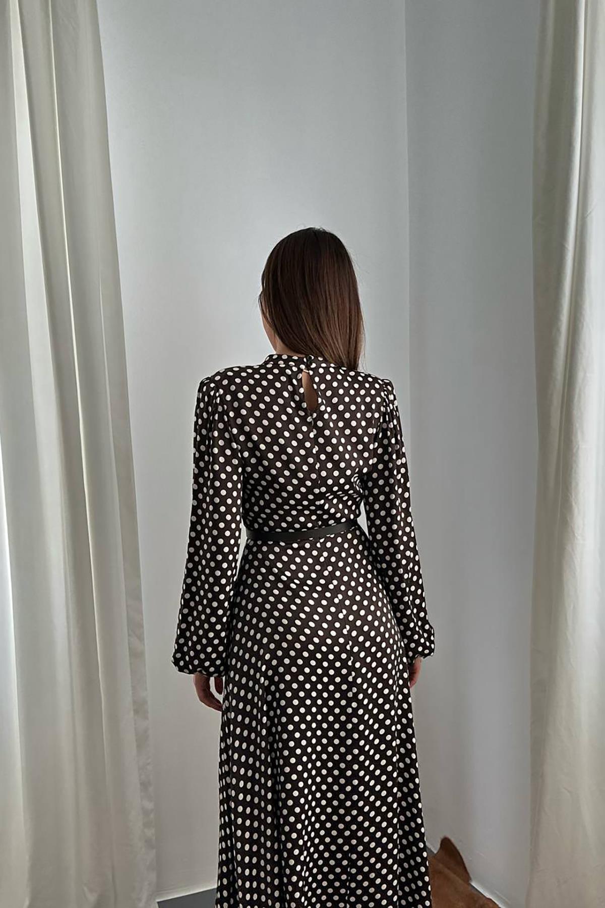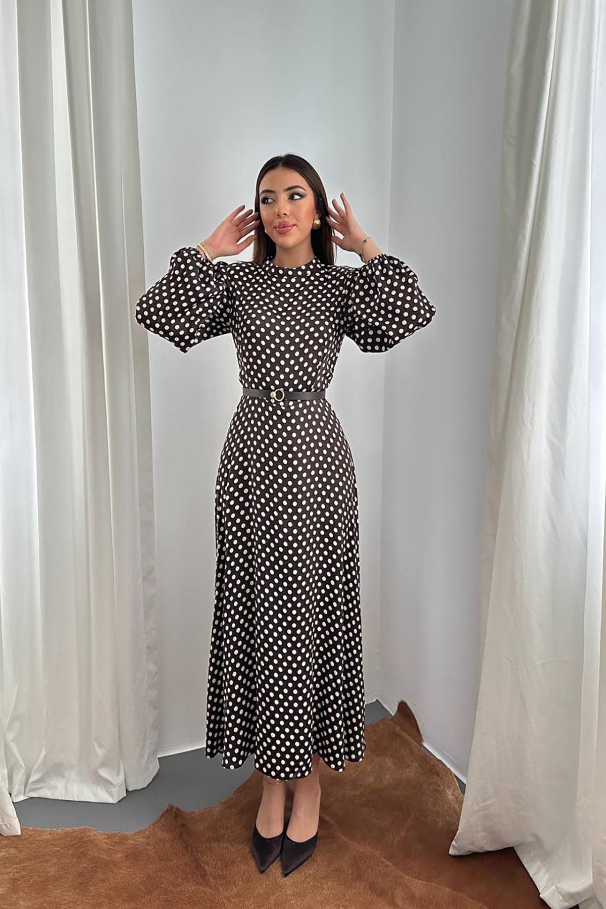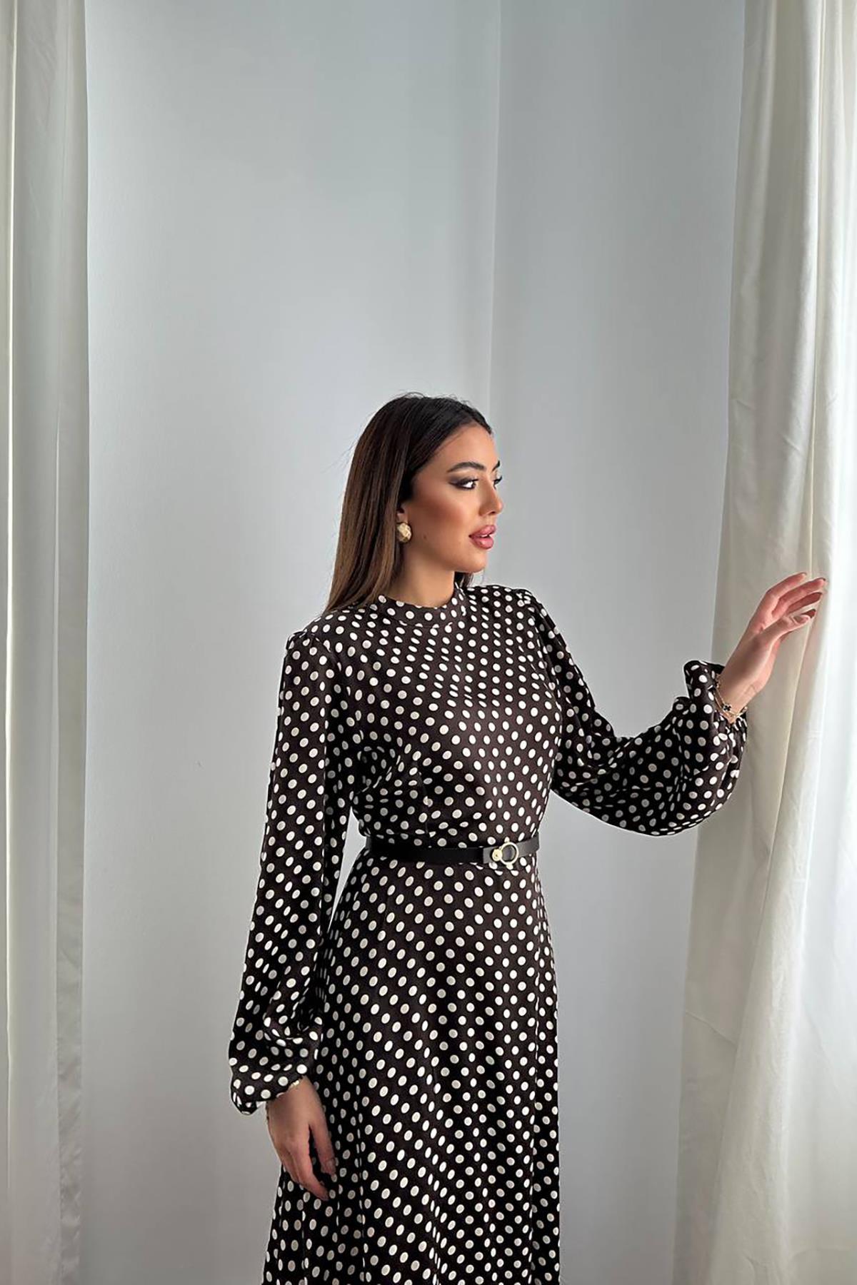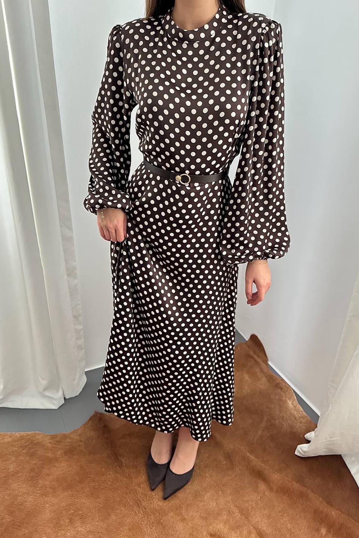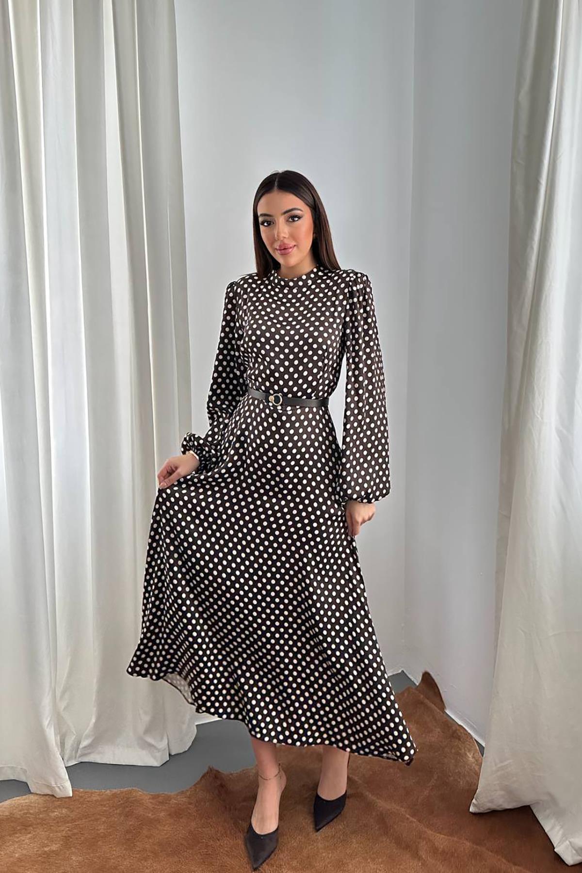 Toptan Kahverengi Kemer Detaylı Puantiyeli Elbise