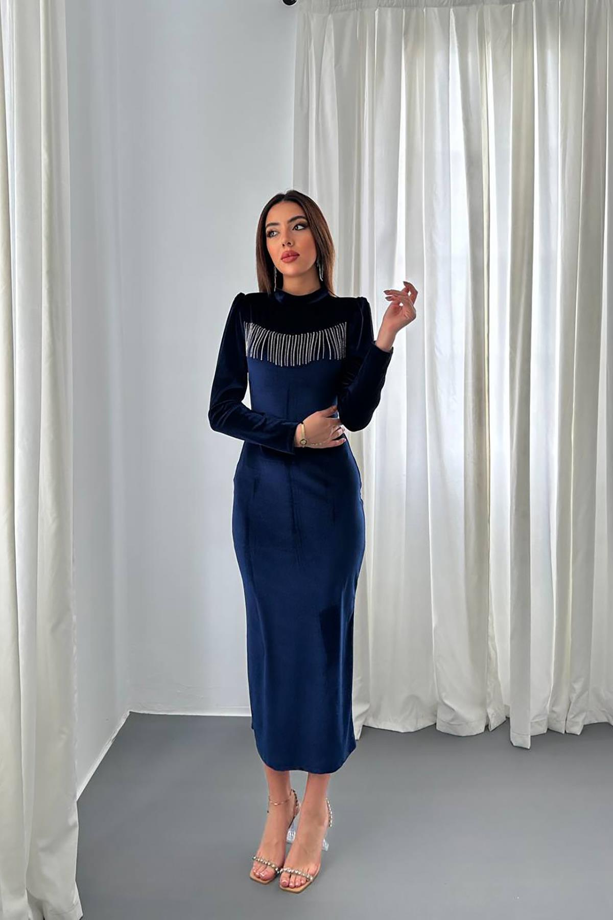 ELS Toptan Lacivert Kadife Işıltılı Elbise - Delaware