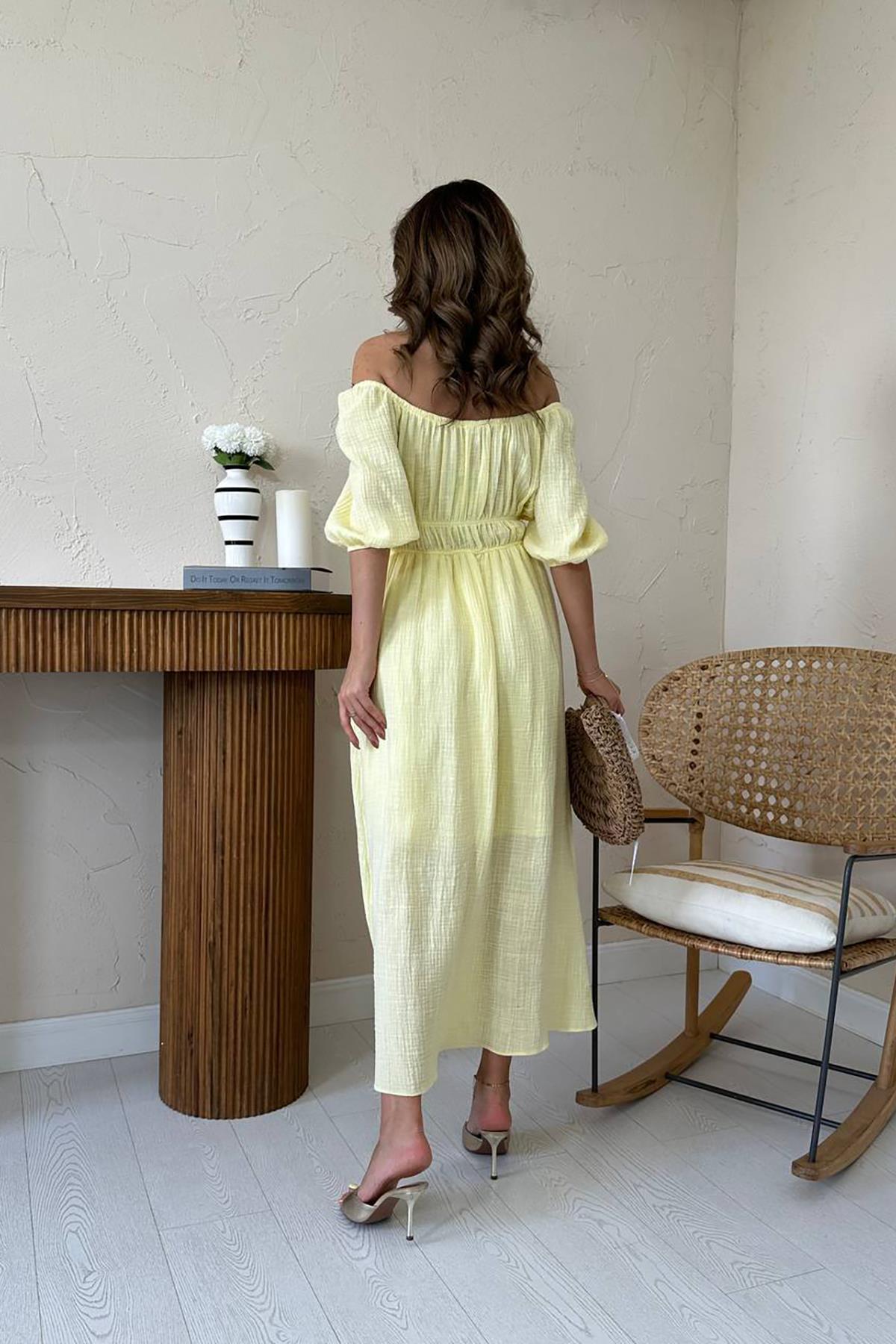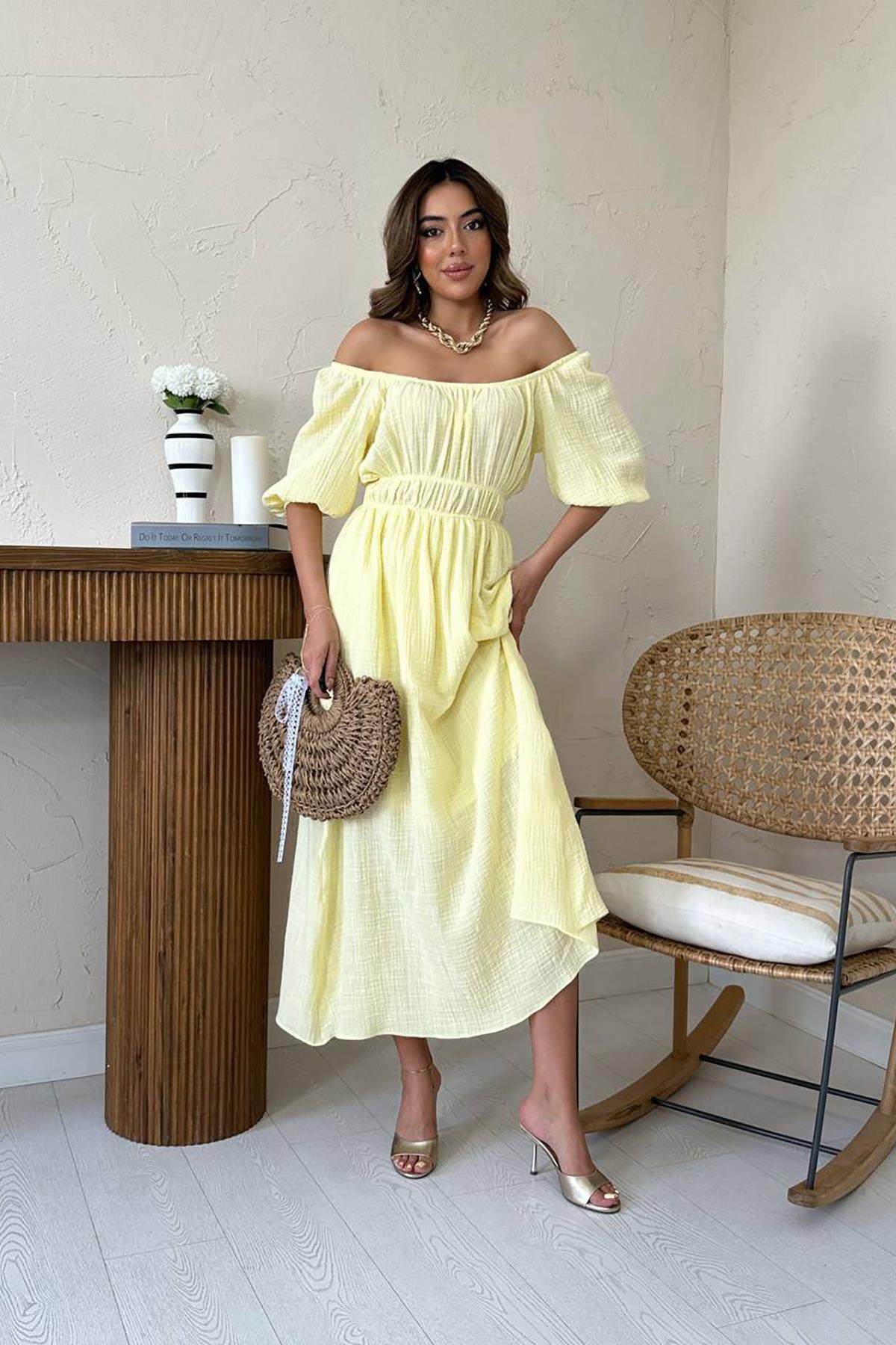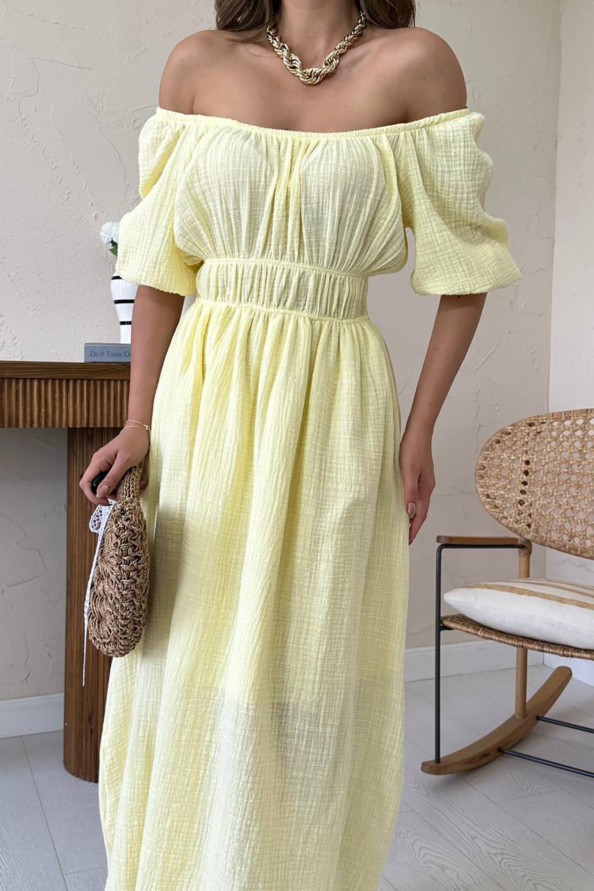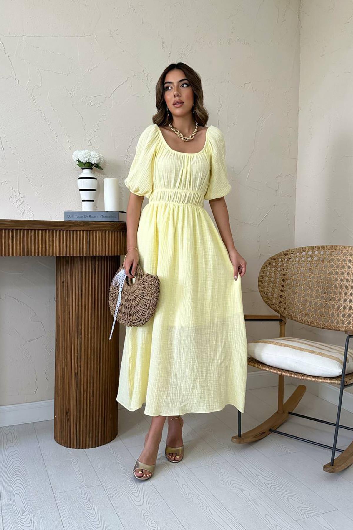 ELS Toptan Sarı Yakası Büzgülü Müslin Keten Elbise - Northampton