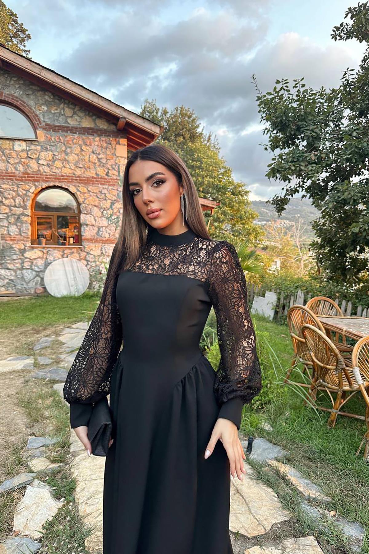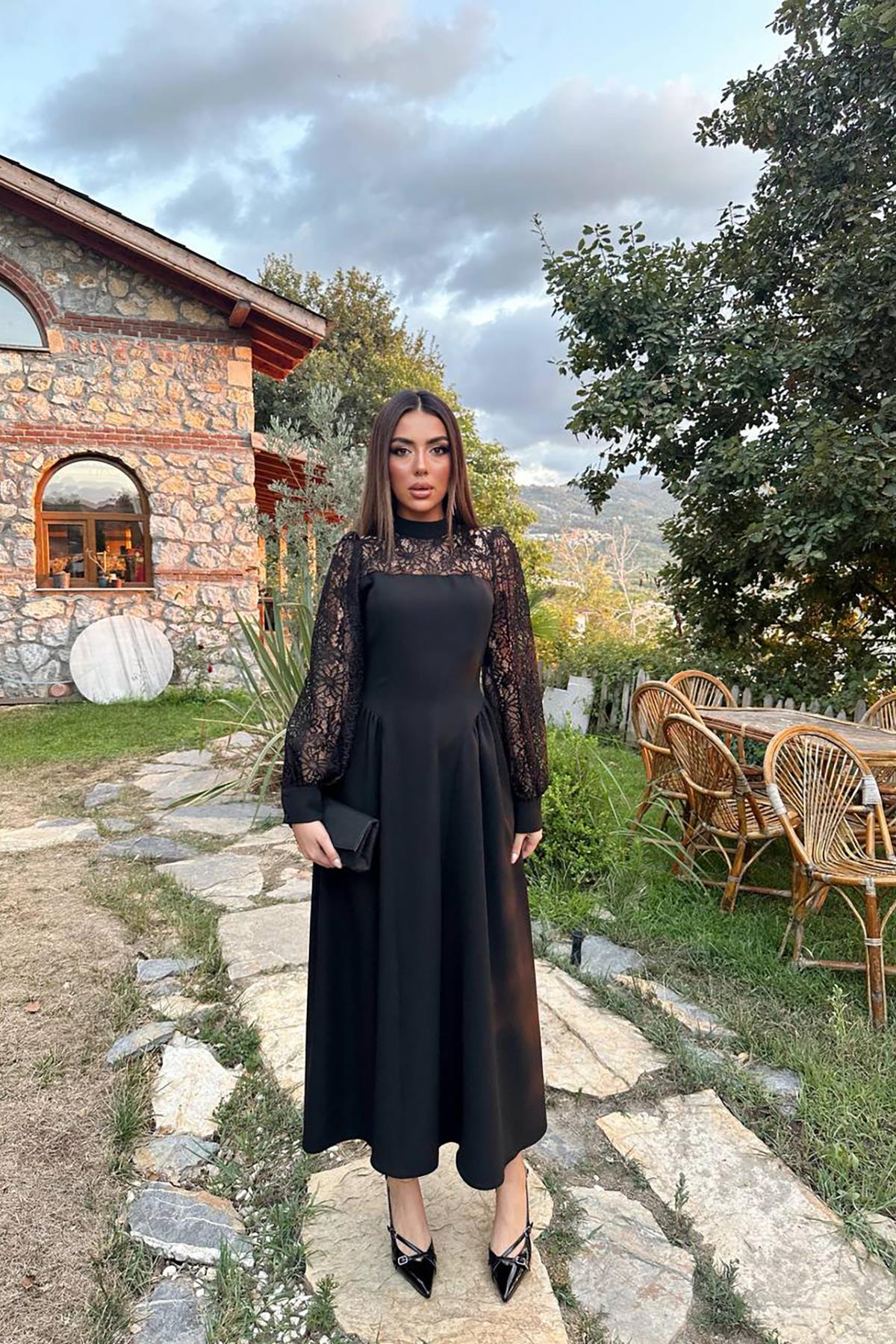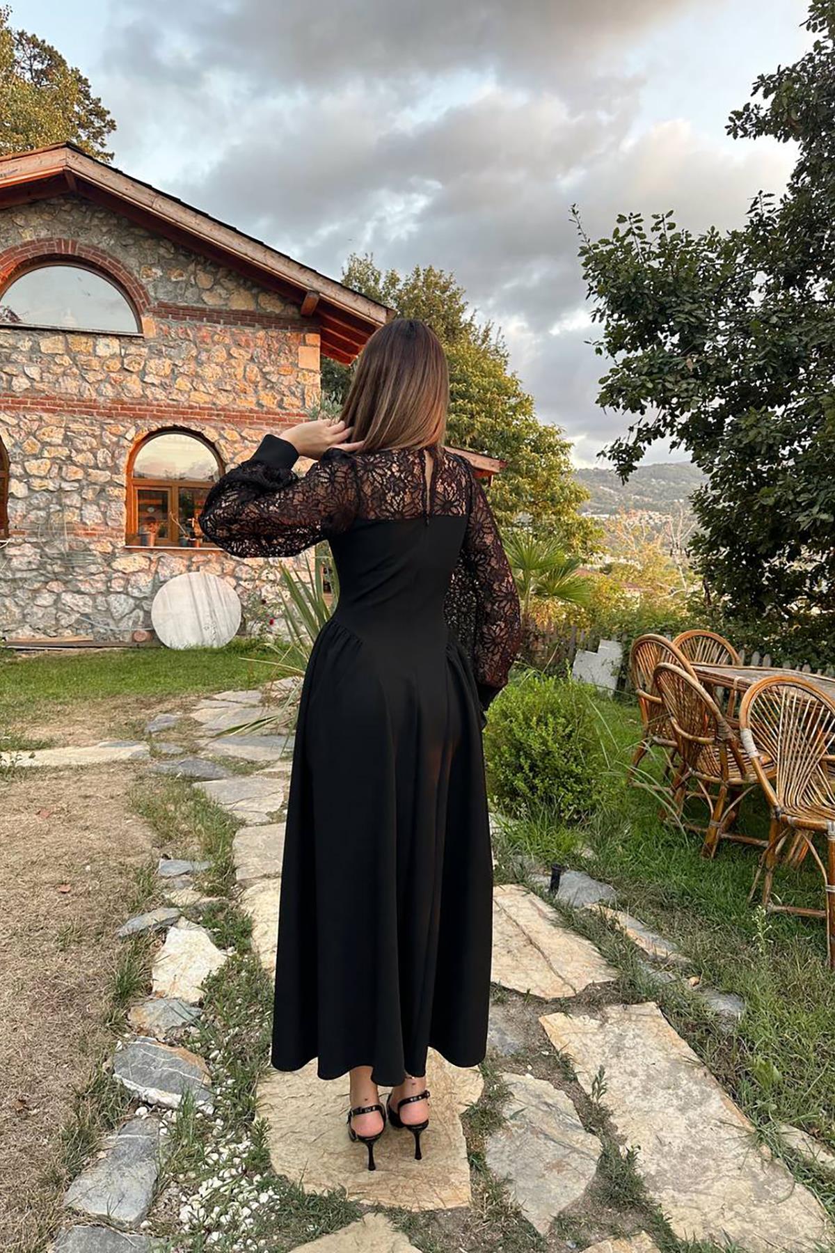 ELS Toptan Siyah Dantel Garnili Büzgülü Atlas Elbise - Northampton