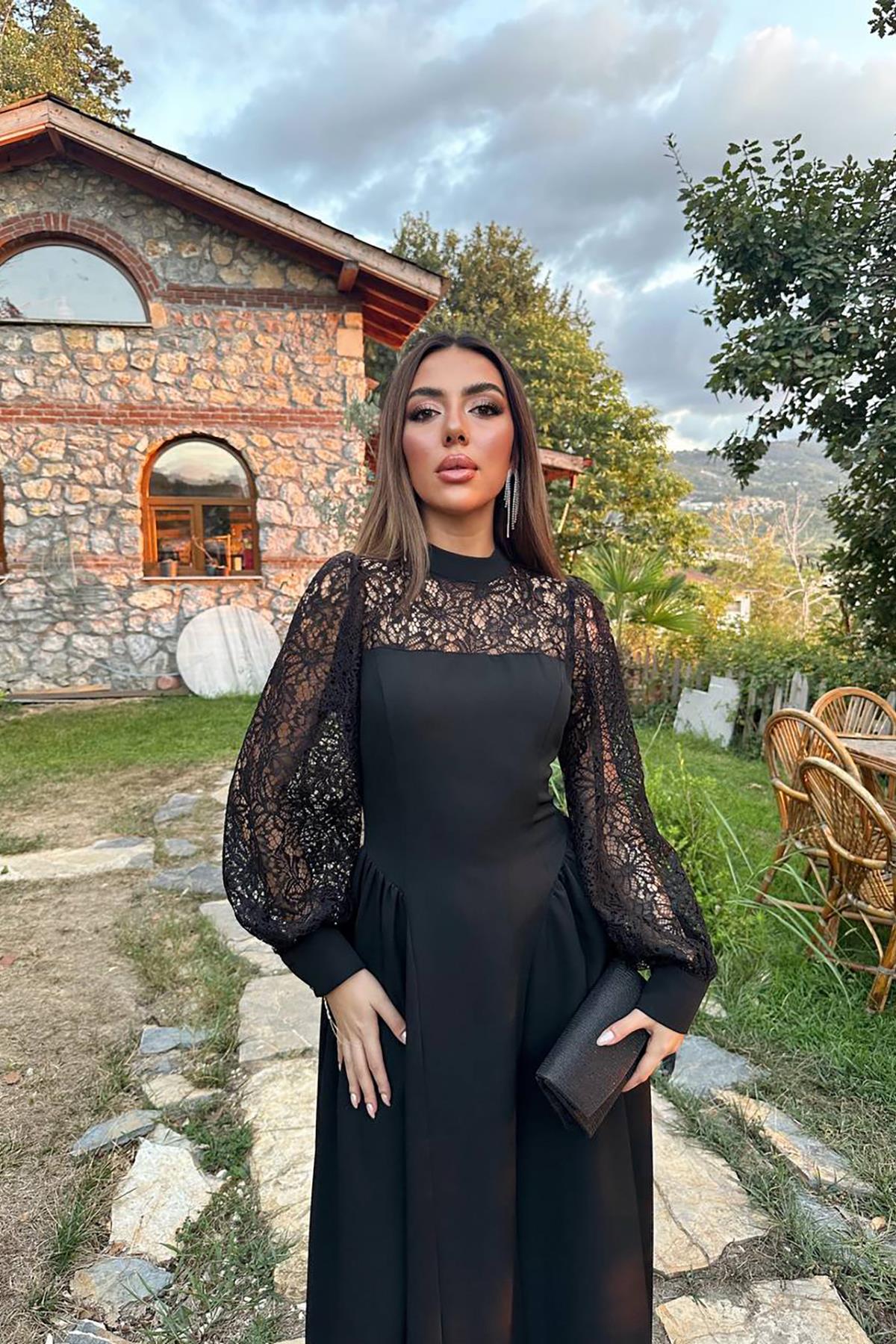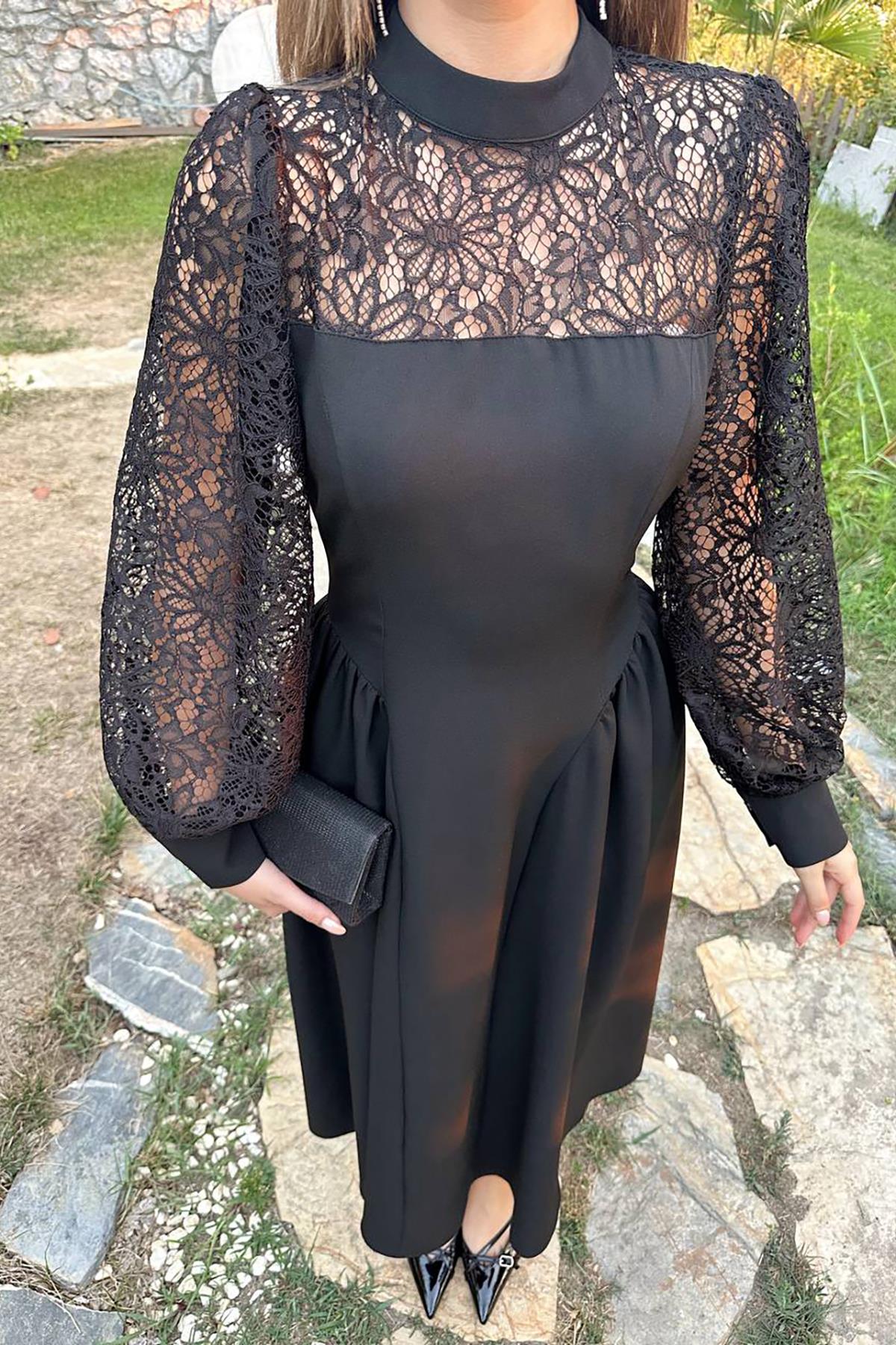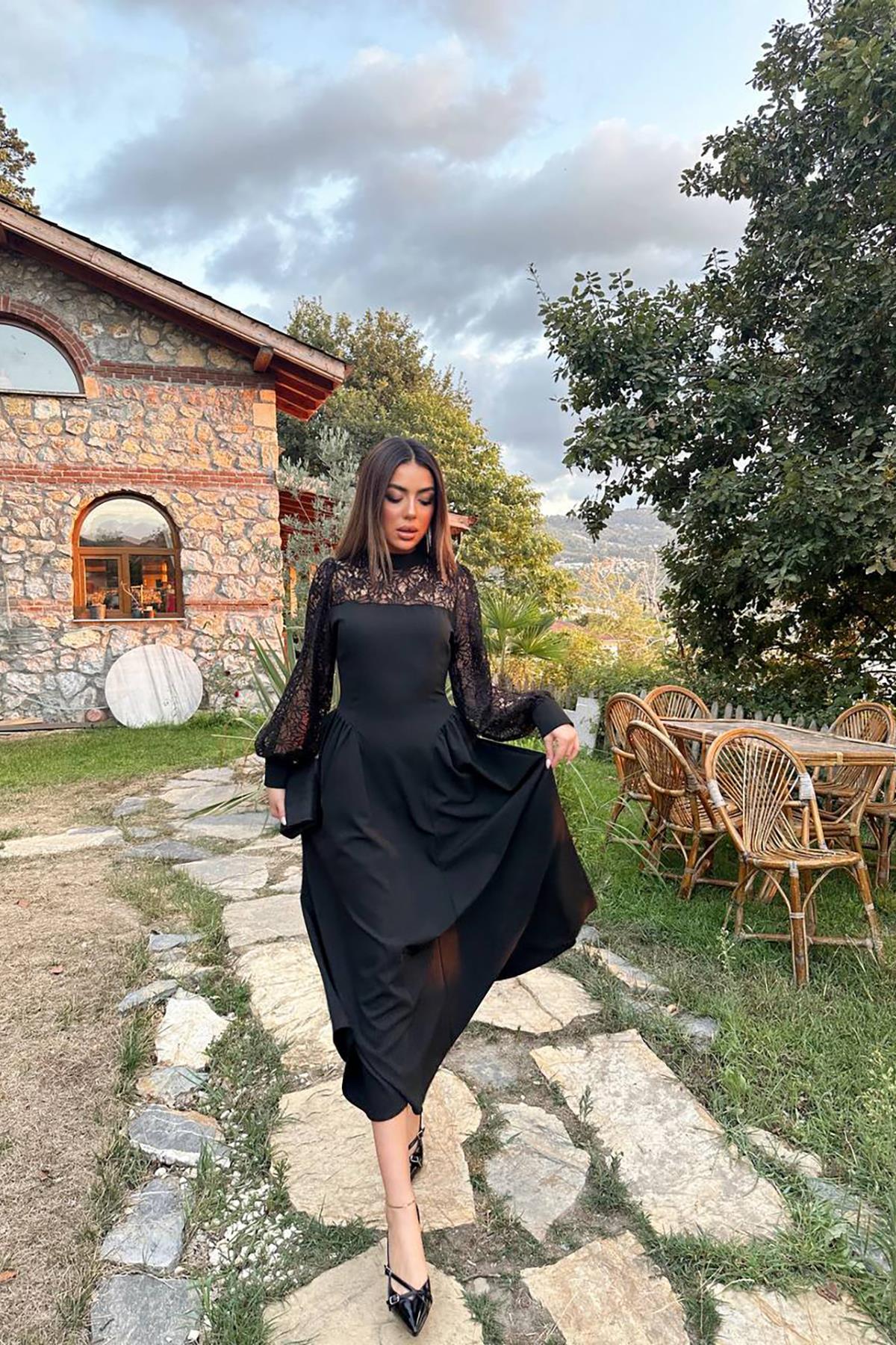 ELS Toptan Siyah Dantel Garnili Büzgülü Atlas Elbise - Northampton