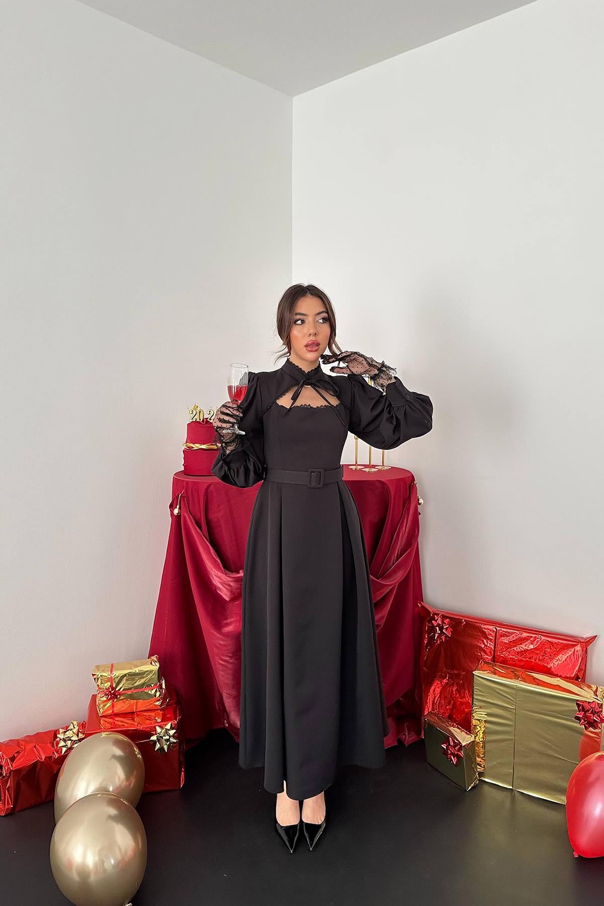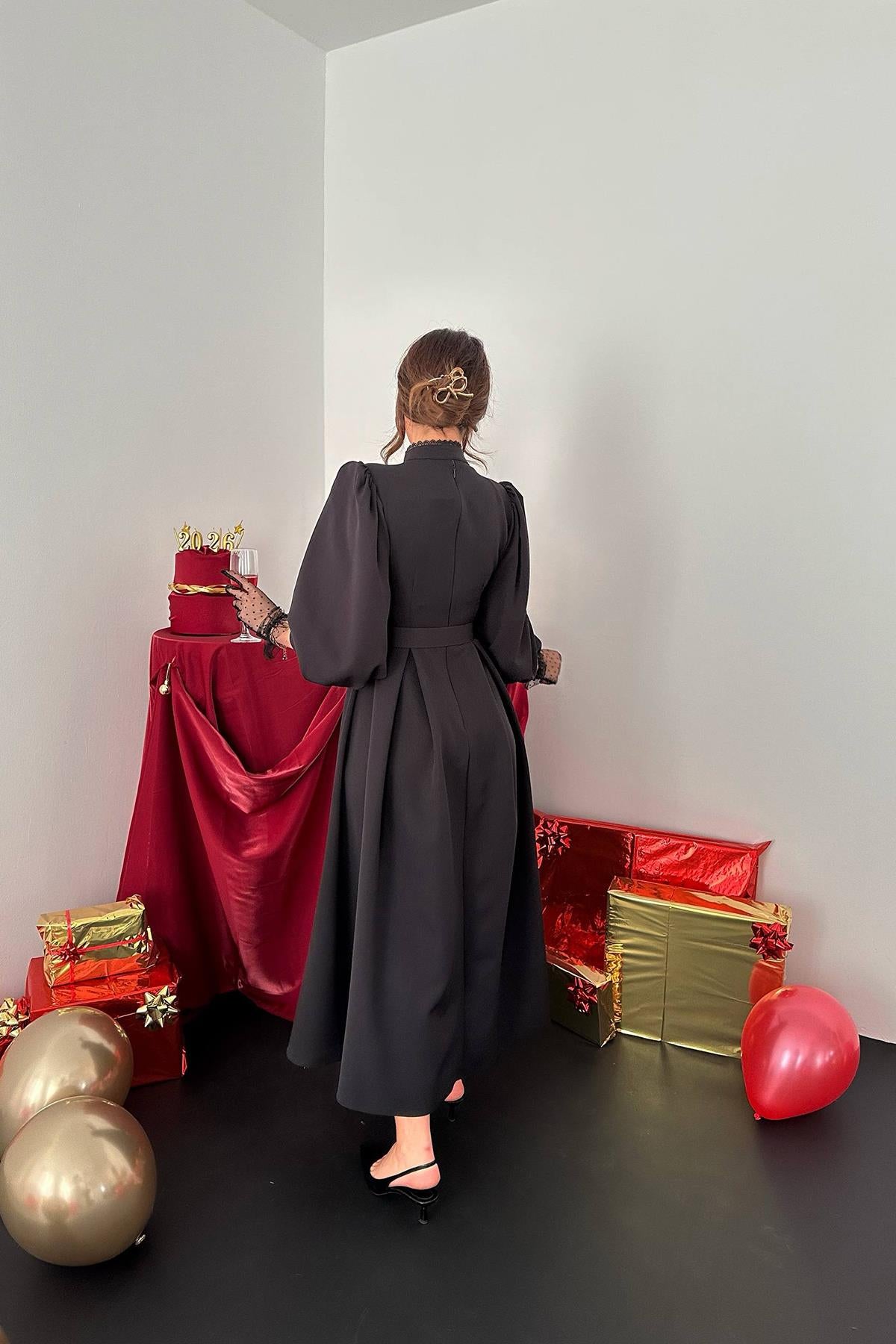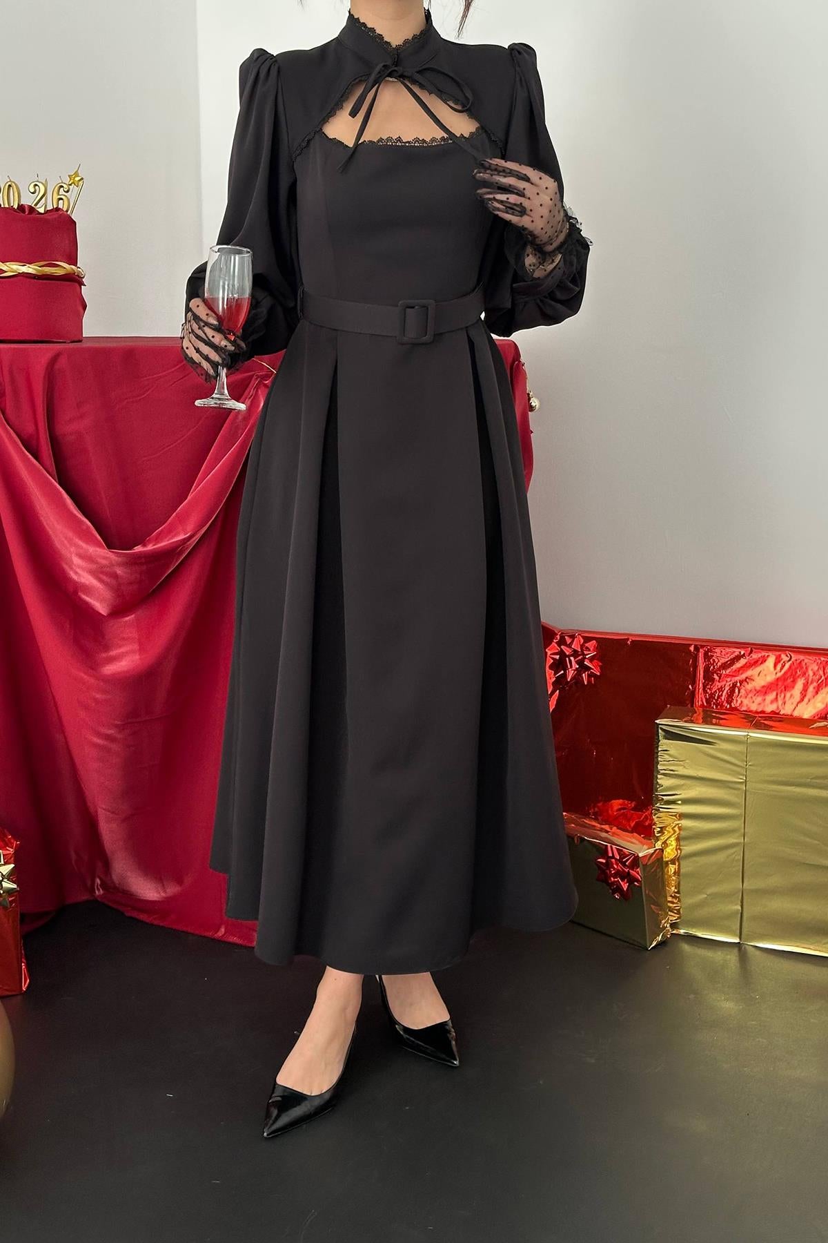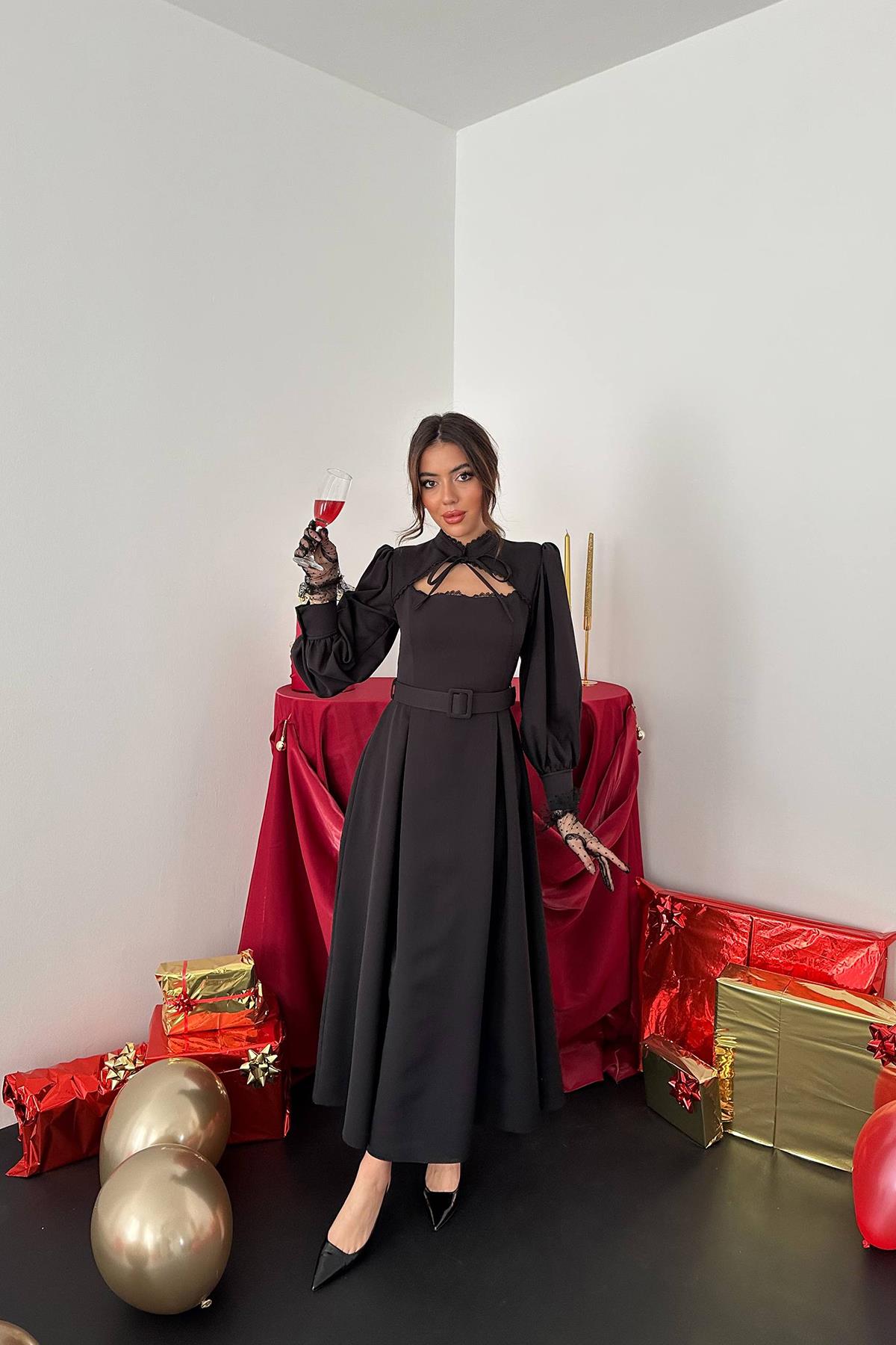 ELS Toptan Siyah Dantelli Kuplu Elbise - Trenton