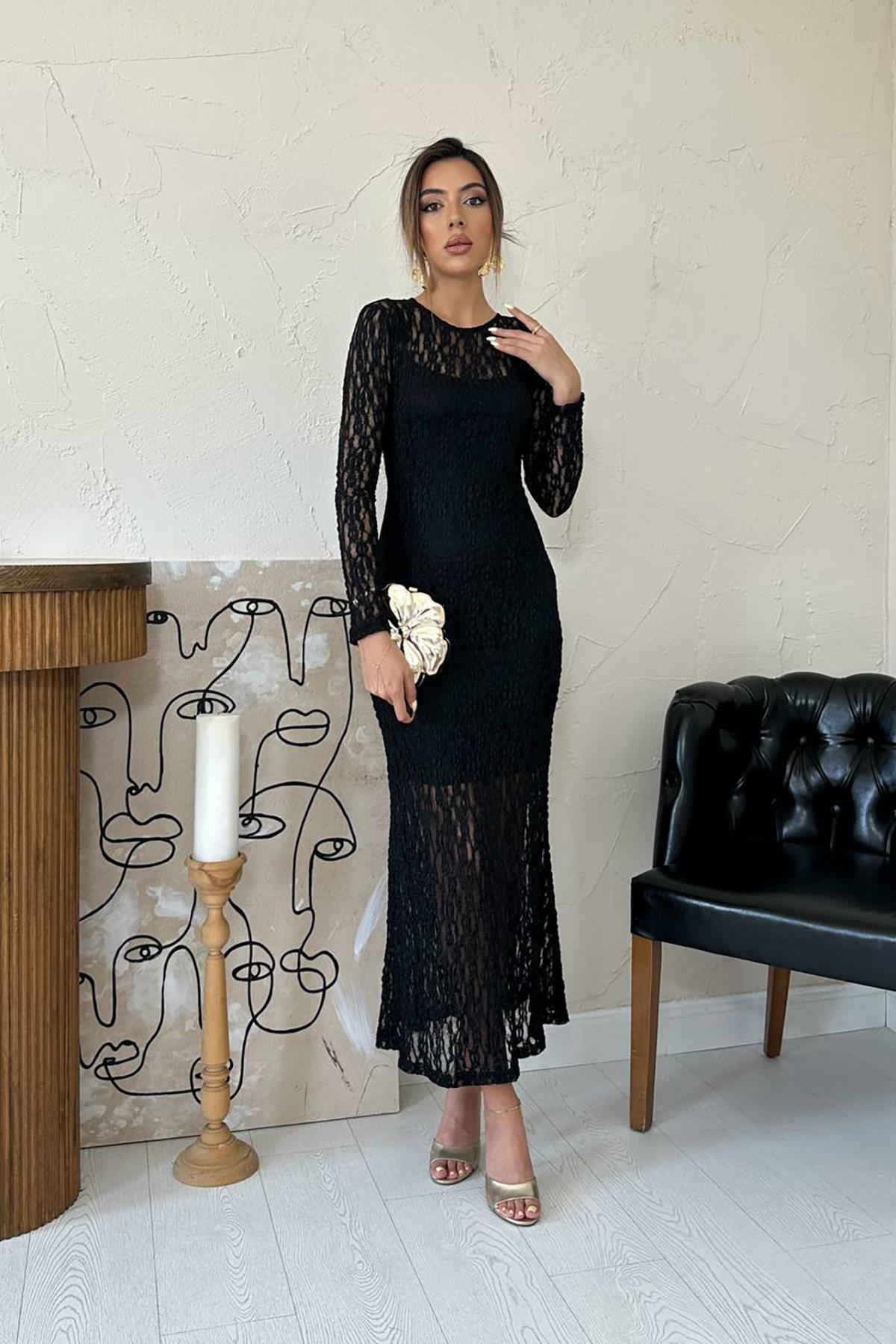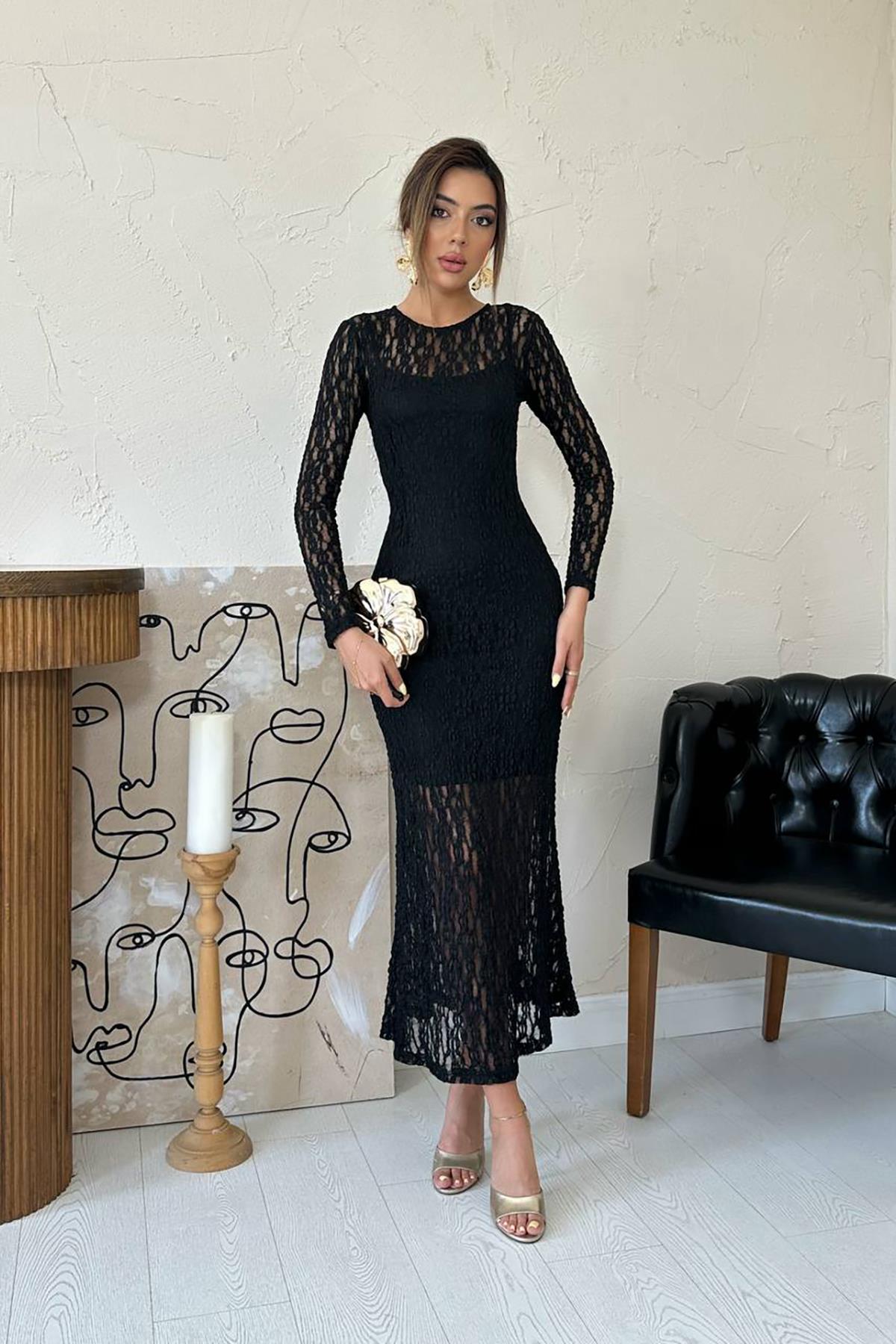 ELS Toptan Siyah Dantelli Uzun Kollu Elbise - San Antonio Enchisi
