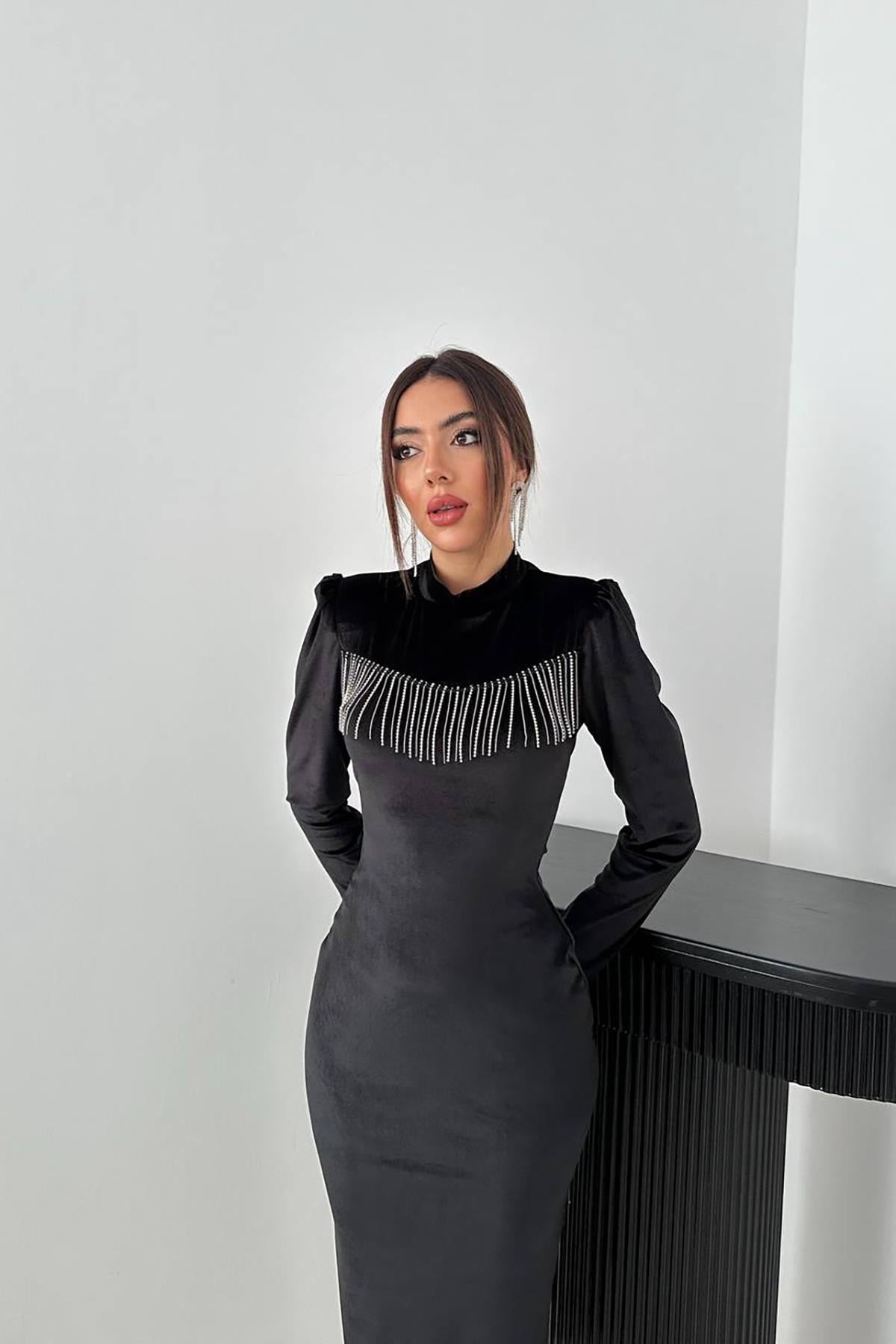 ELS Toptan Siyah Kadife Işıltılı Elbise - Bornheim