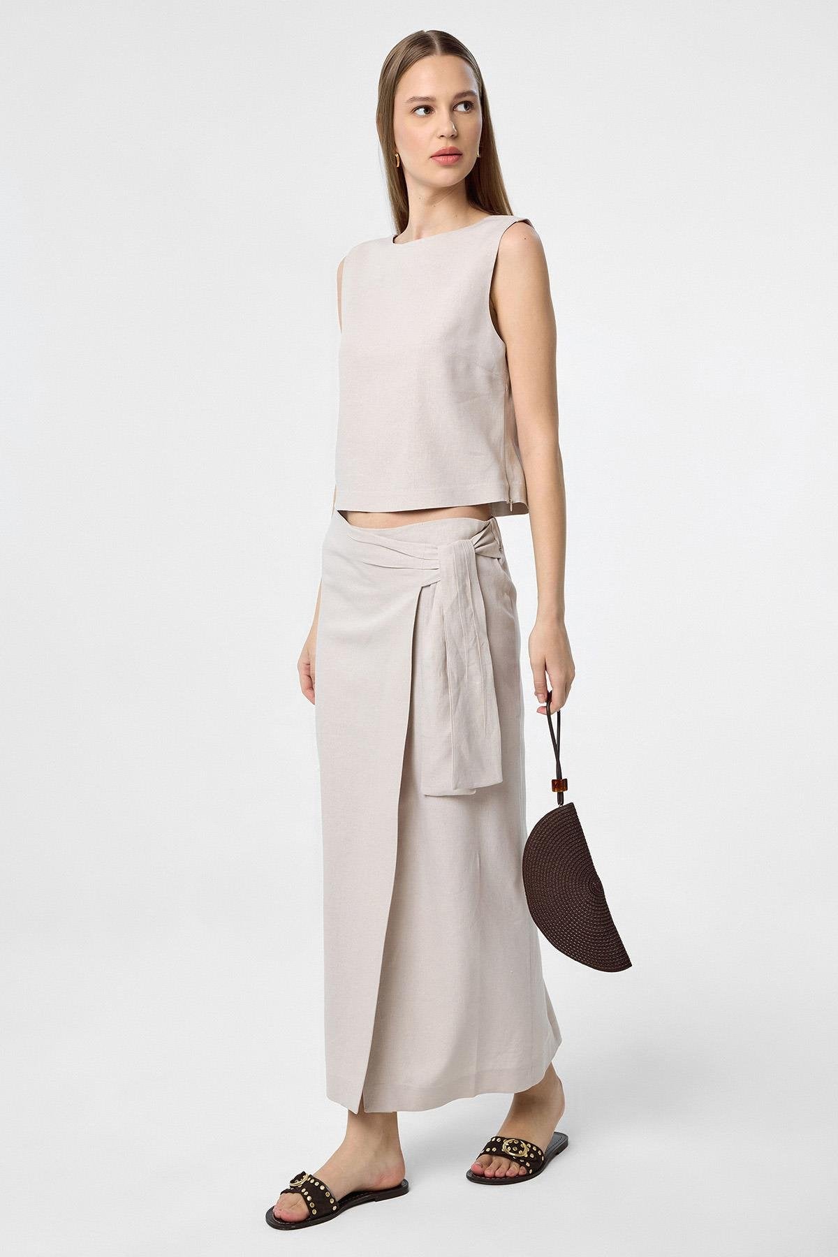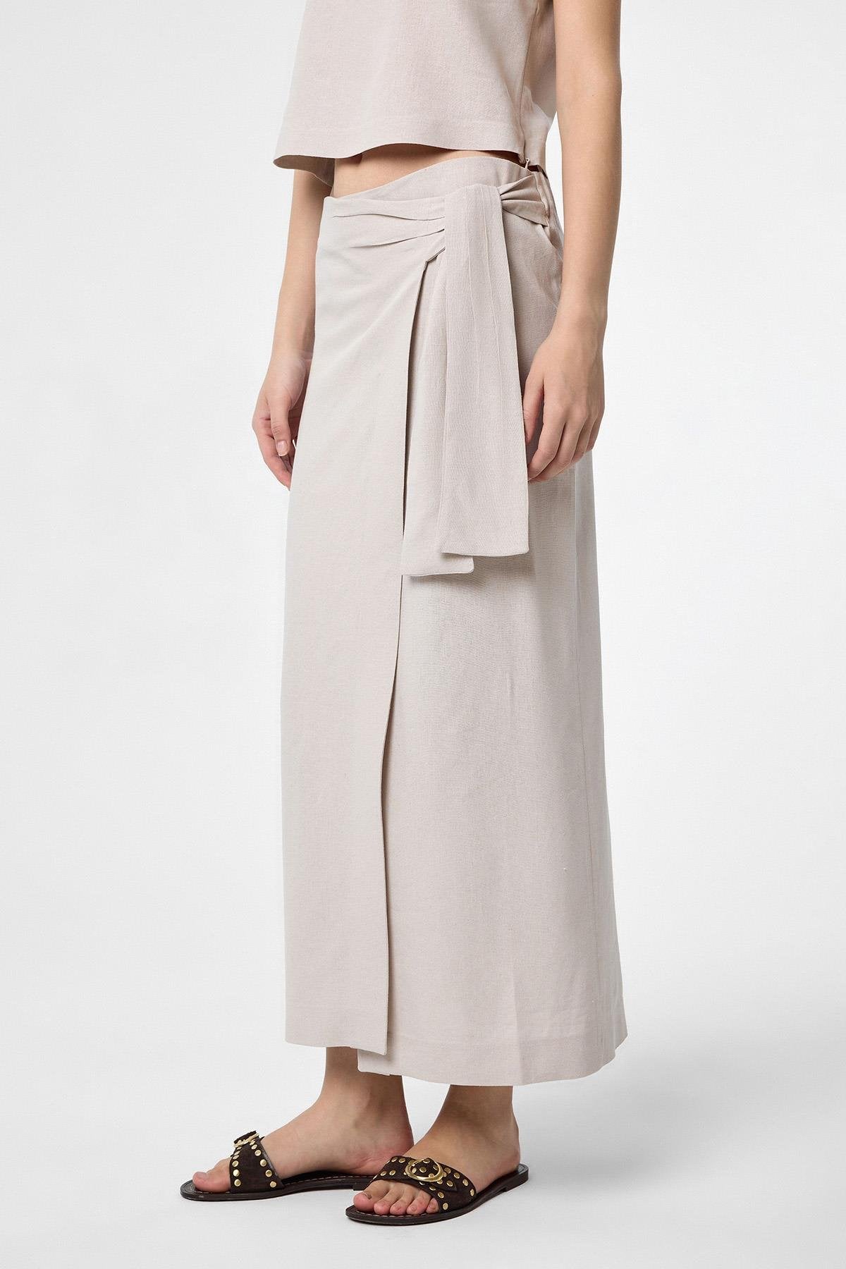 ANT Antioch Bej Keten Karışımlı Kuşaklı Kadın Etek - Arvada