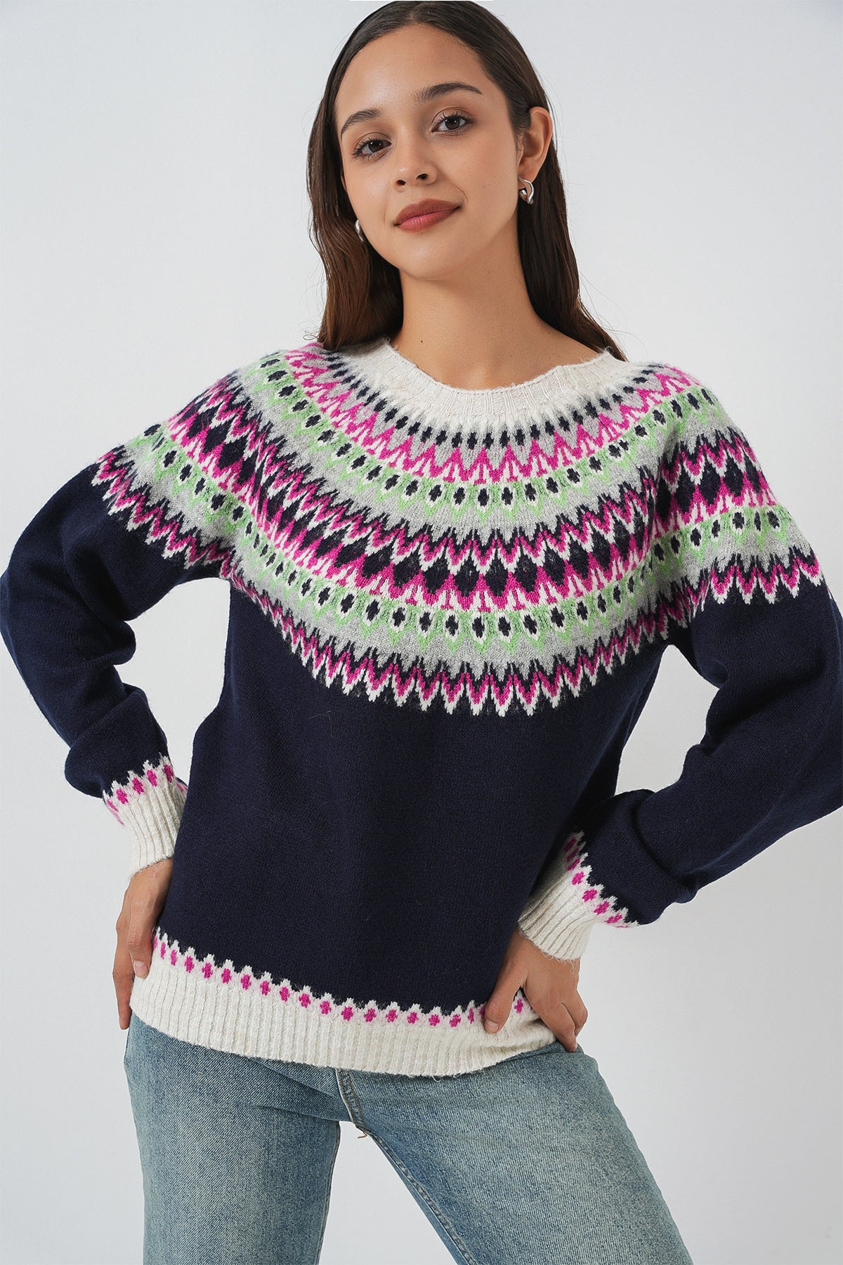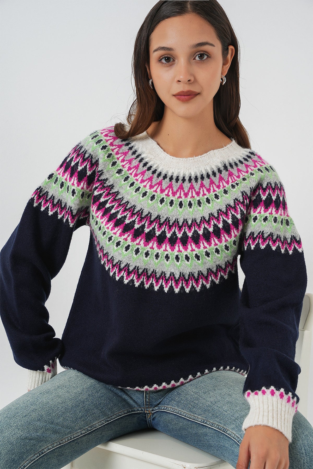 BGD Women Kadın Desenli Triko Kazak 15932 - Lacivert - Brunswick