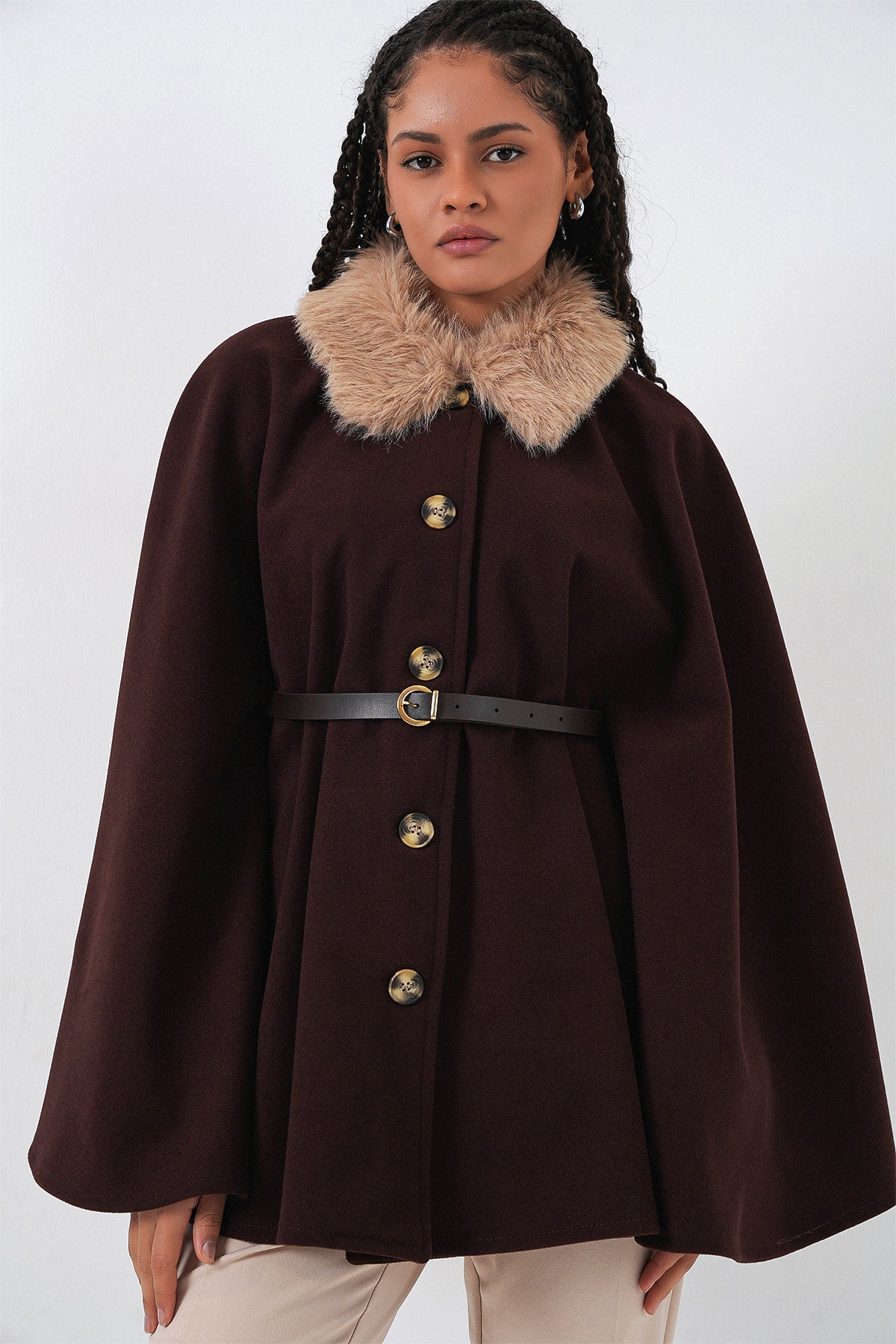 BGD Women Kadın Kemerli Kaşe Panço 9165 - Kahverengi - Kensington