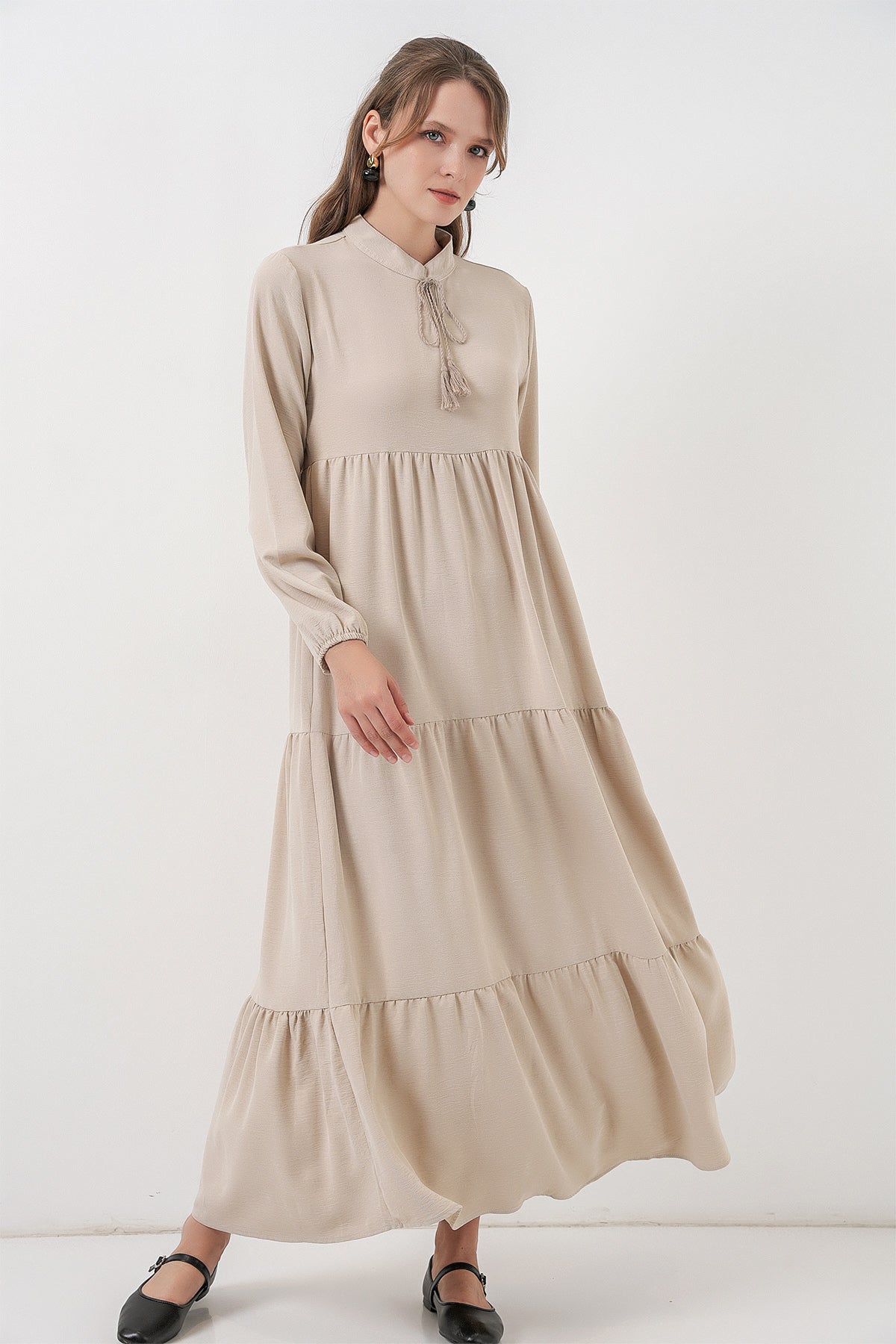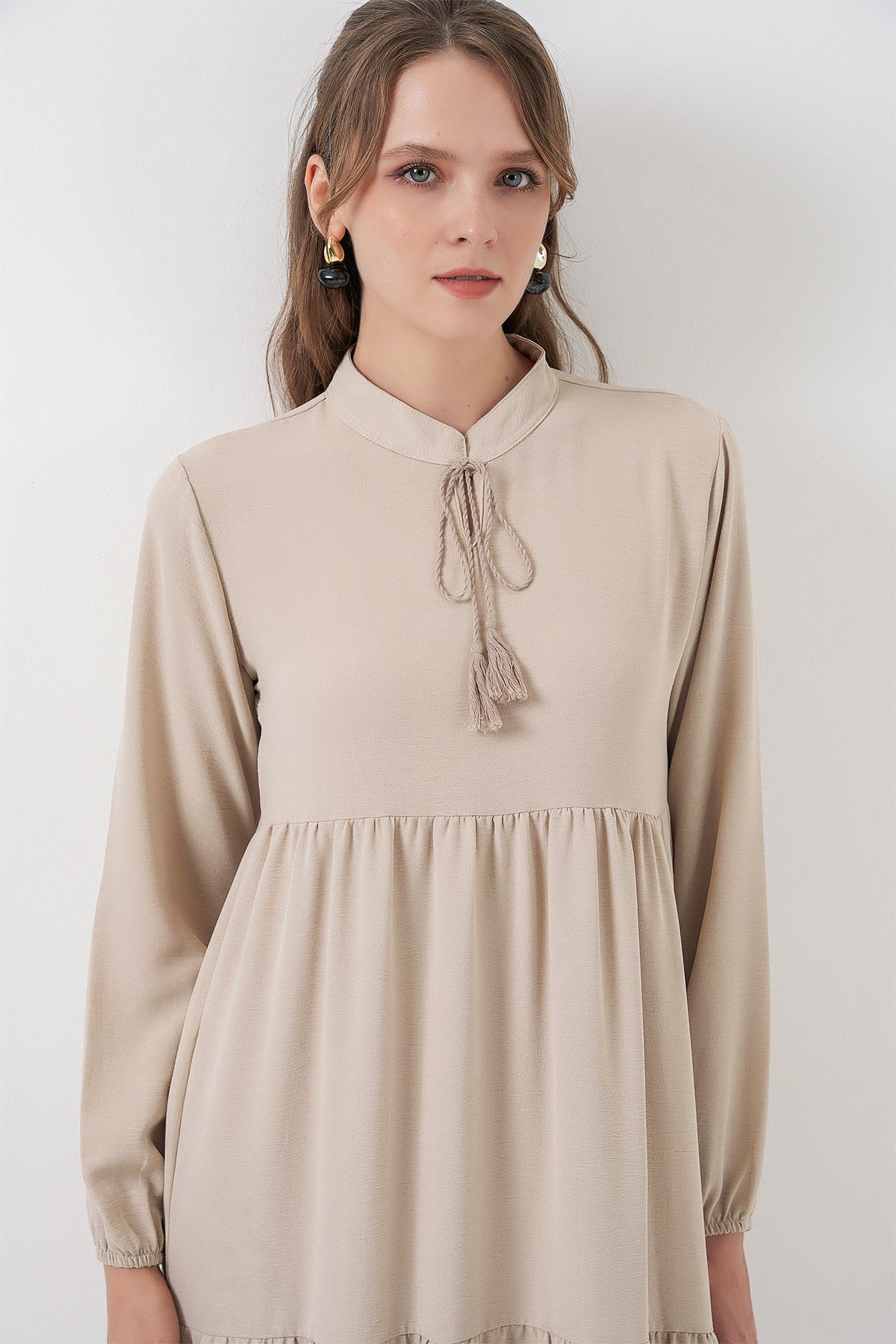 BGD Women T1627 Yaka Bağcıklı Elbise - Taş - Lufkin