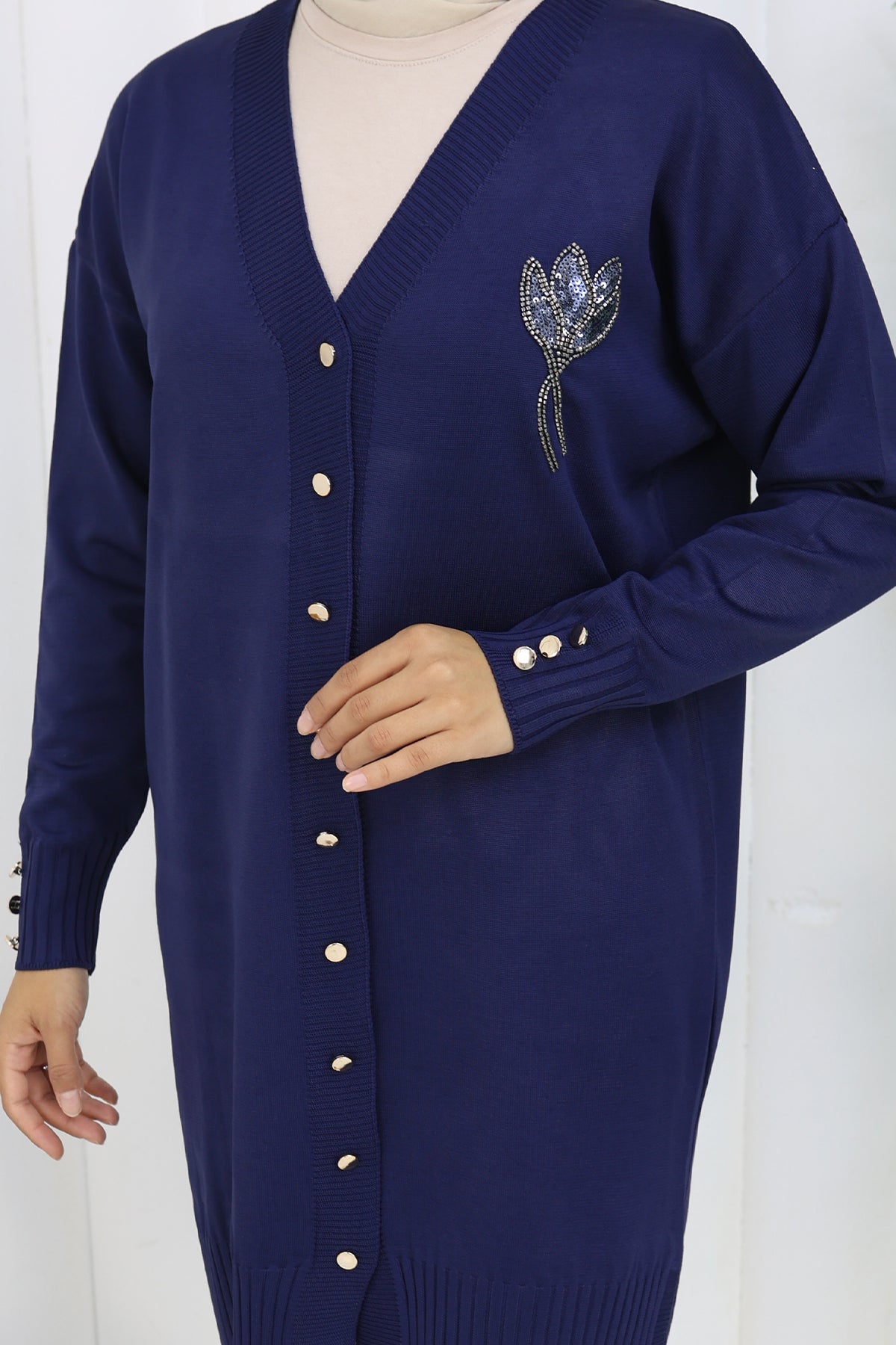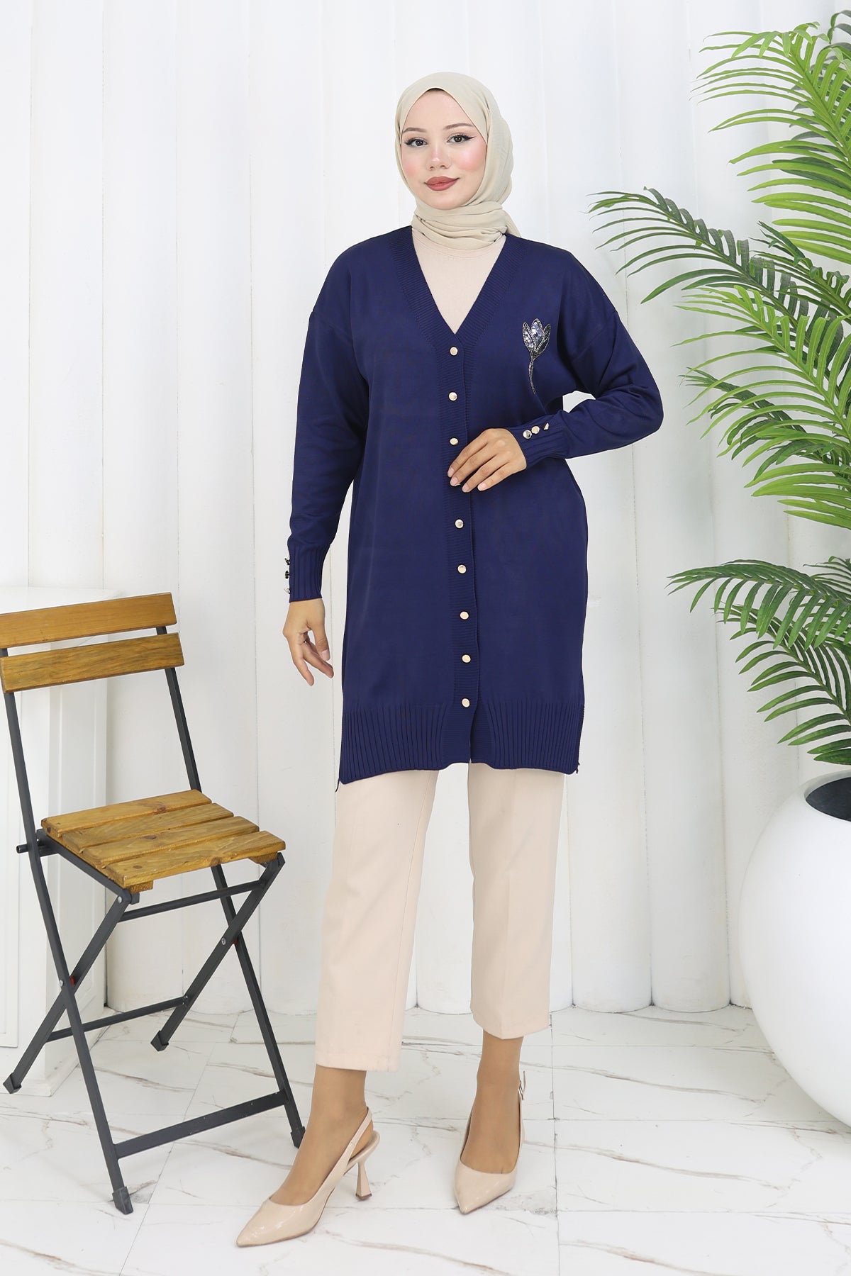 BNG Women Yaka Detaylı Uzun Merserize Hırka N3260 Lacivert - Lancaster