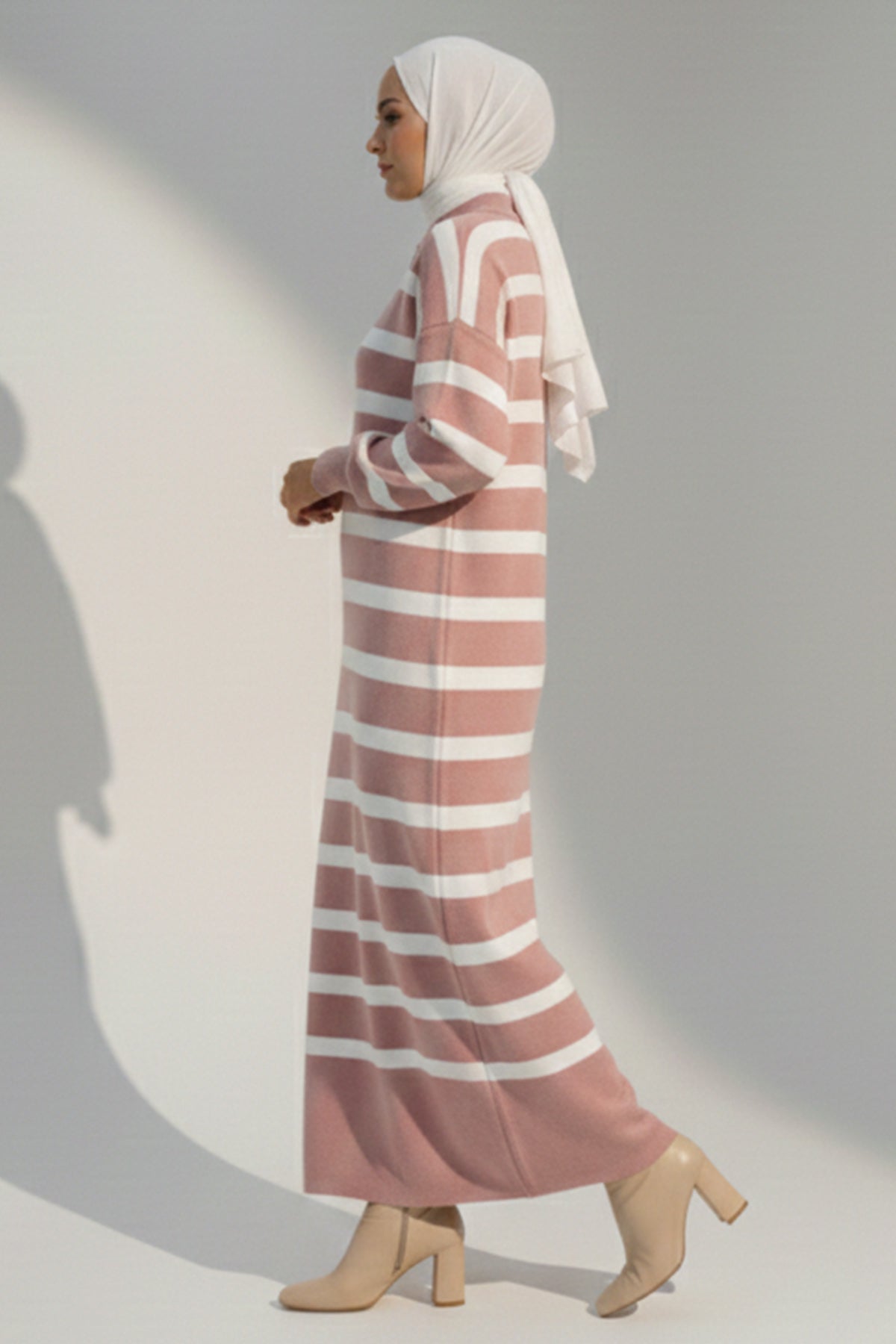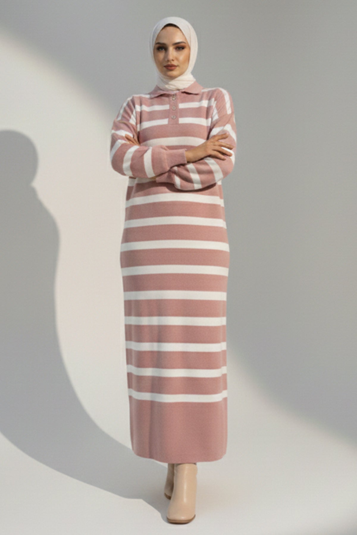 BNG Women Yakası Düğme Detaylı Çizgili Triko Elbise 11031 Pudra - Beverly