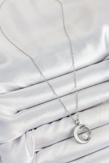 EBJ 316L Stainless Steel Crescent Moon Model Necklace with Zircon Stone and Pearl Detail Silver Color Women's Necklace - Bietigheim-Bissingen