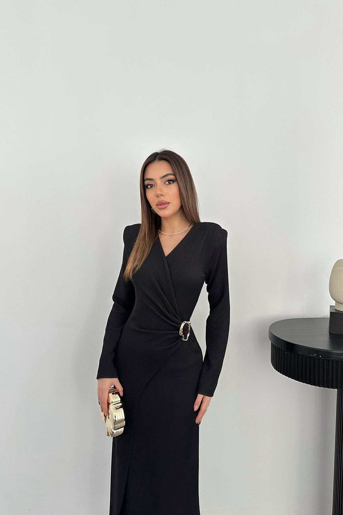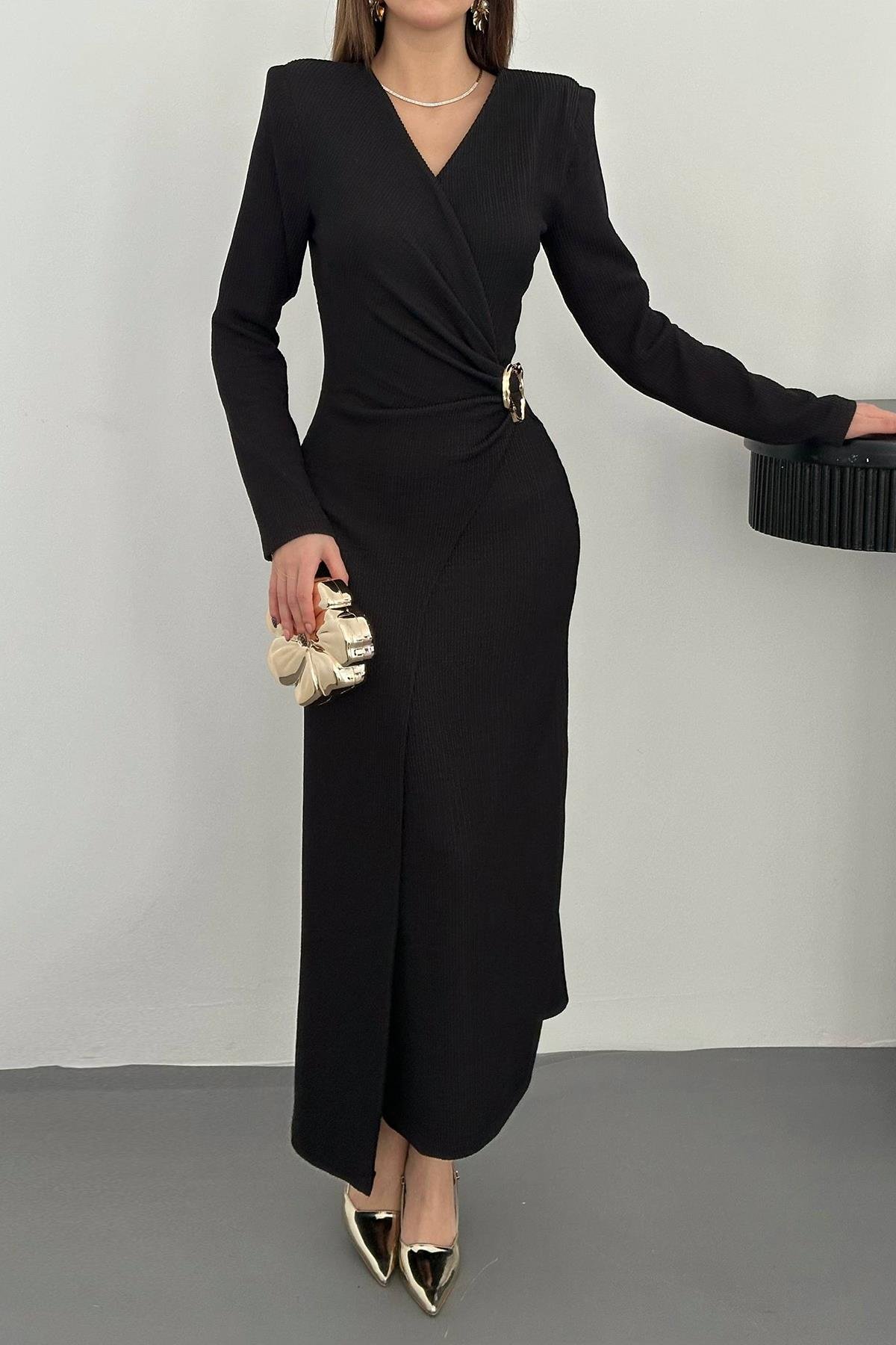 ELS Toptan Siyah Büzgü Detaylı Tokalı Elbise - Merced