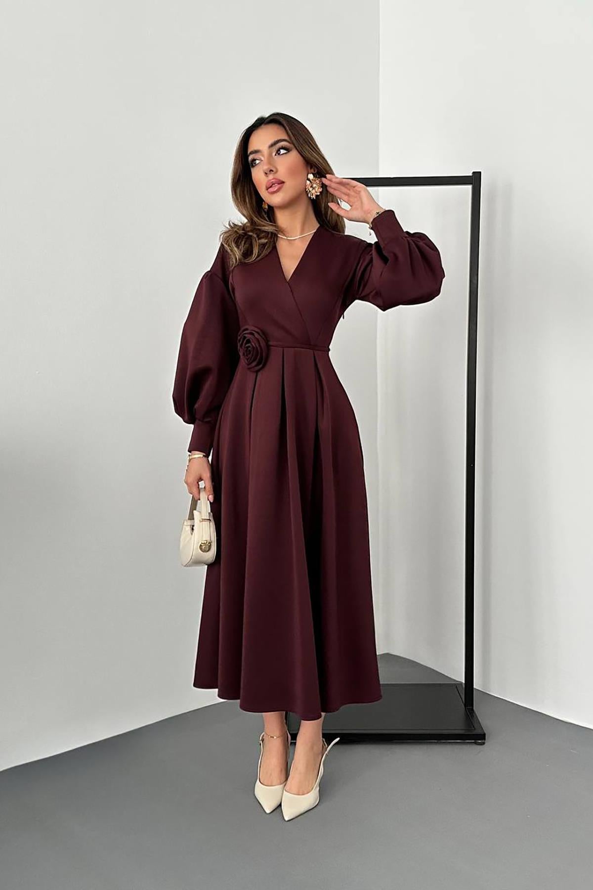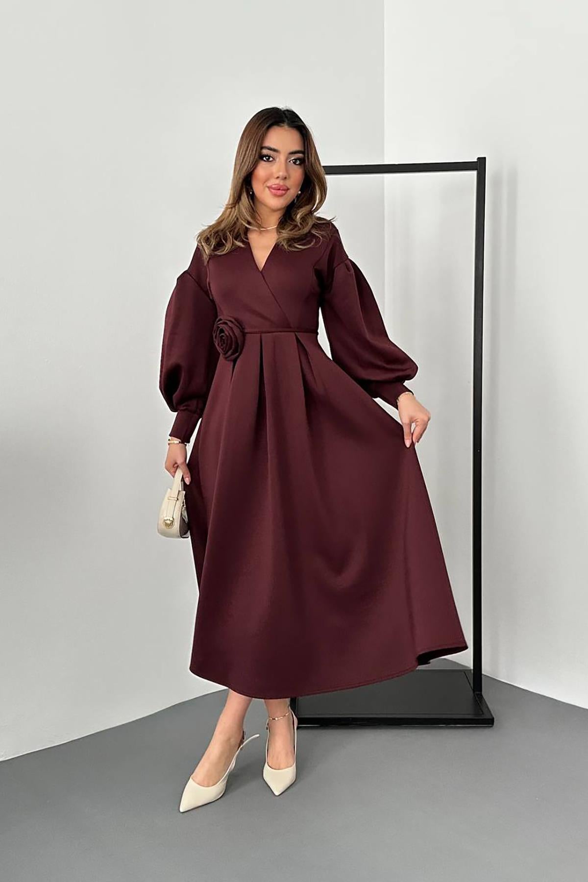 Wholesale Burgundy Rose Detailed Scuba Dress