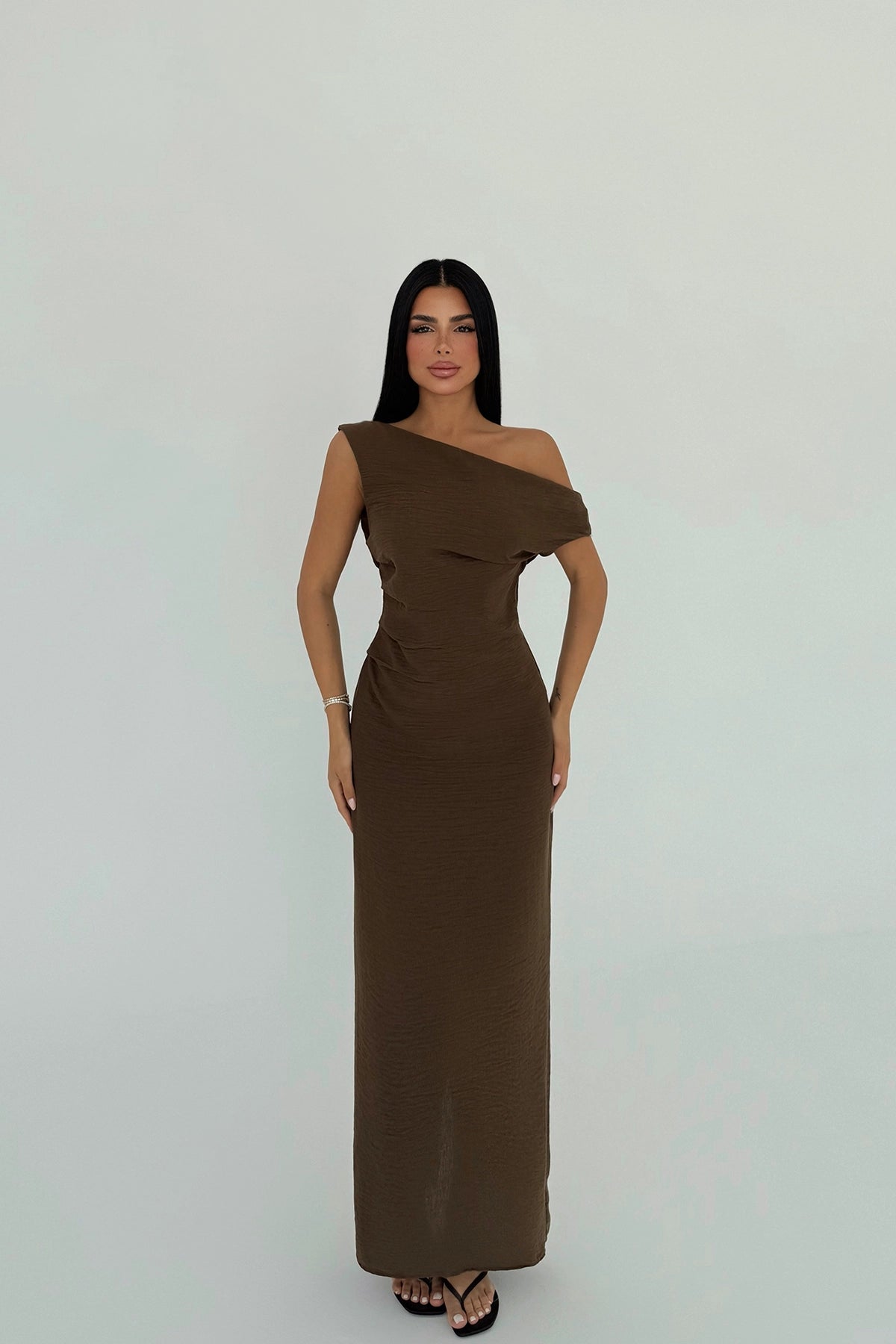 Brown Slit Detail Pleated Dress