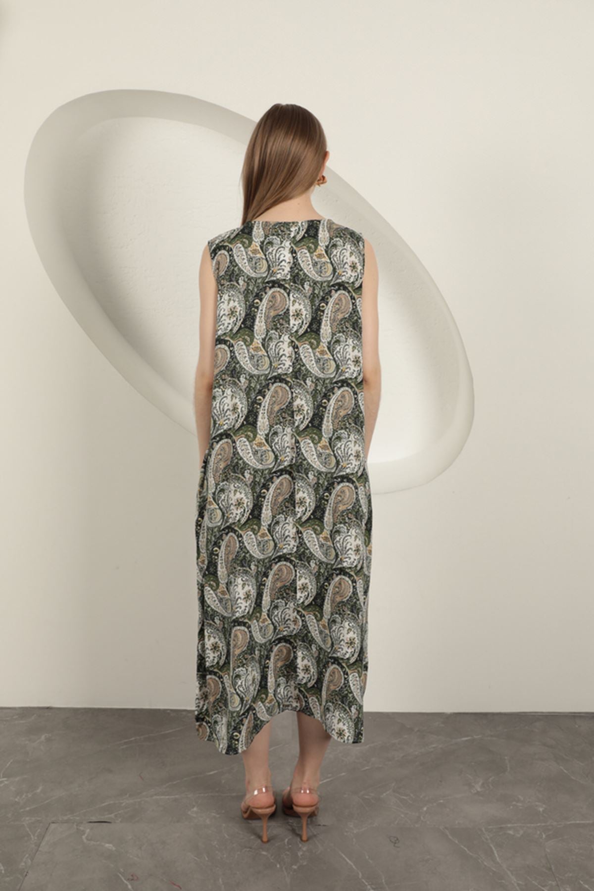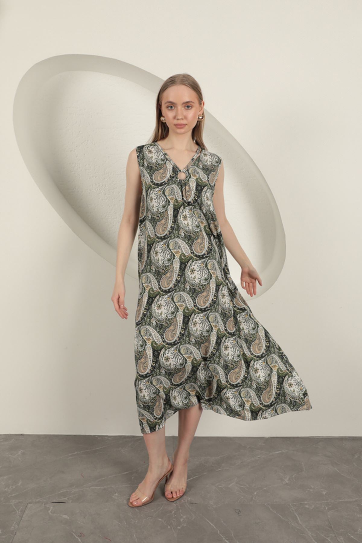 KKT Viskon Kumaş Etnik Desenli Elbise-Yeşil - Normal