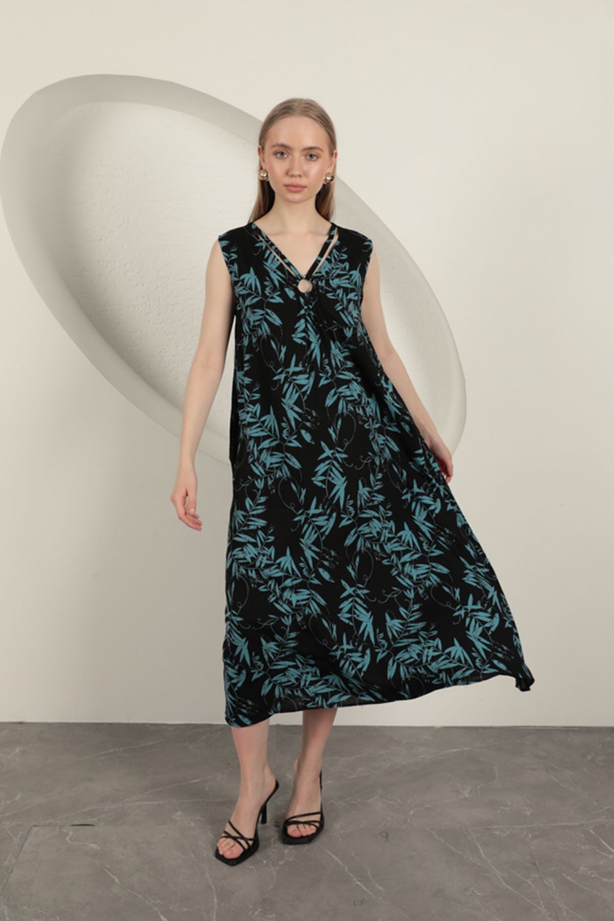 KKT Viskon Kumaş Yaprak Desenli Elbise-Mavi - Florin