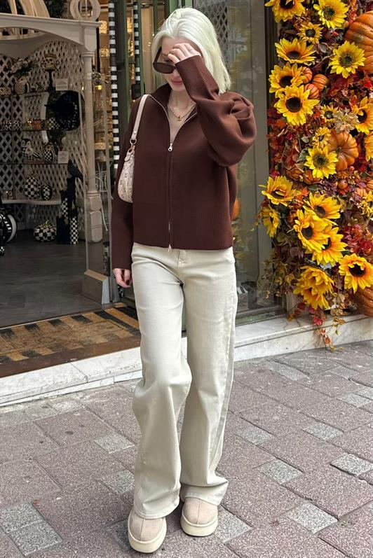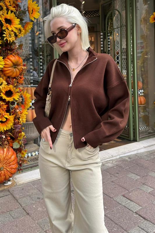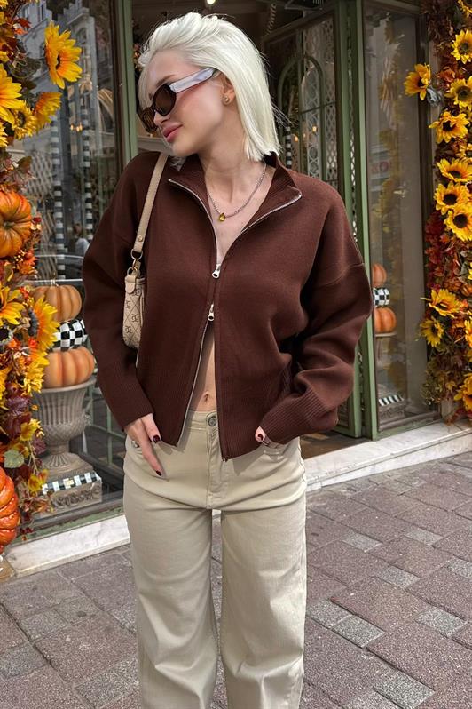 MDX Acı Kahverengi Çift Fermuarlı Dik Yaka Kadın Triko Hırka MG2505 - Aveiro
