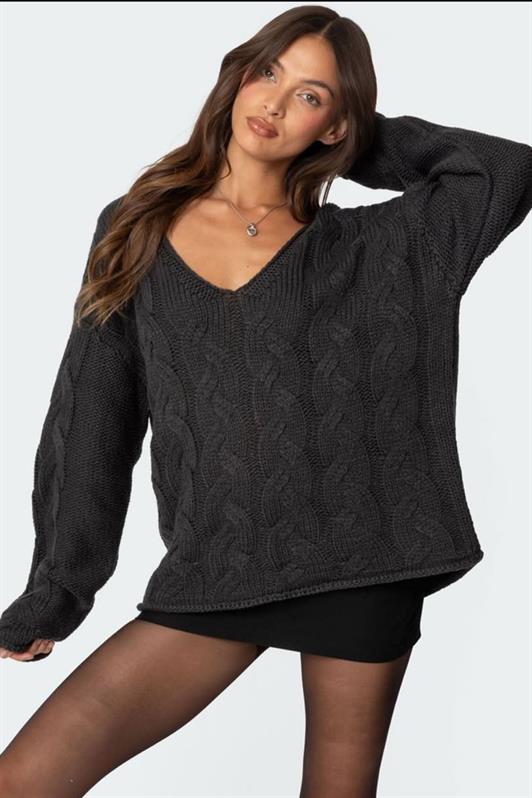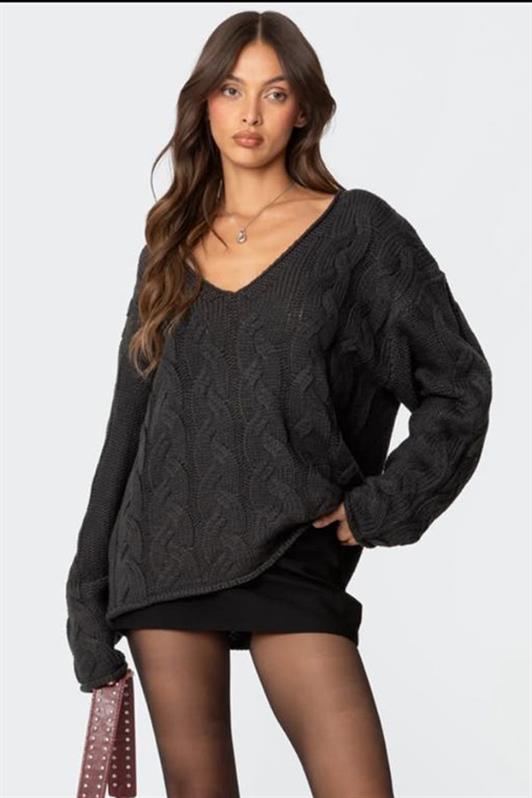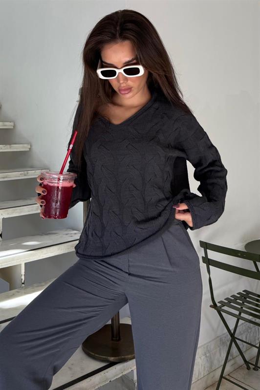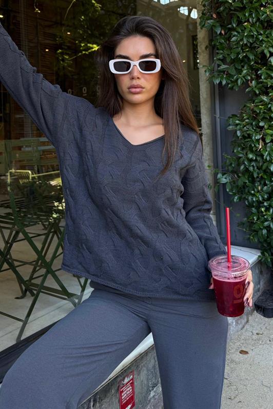 MDX Antrasit V Yaka Örgü Desen Oversize Kadın Kazak Mg2519 - Isla