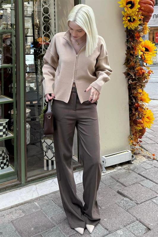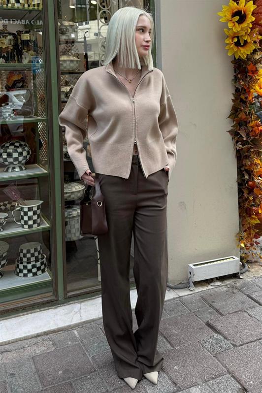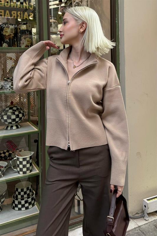 MDX Bej Çift Fermuarlı Dik Yaka Kadın Triko Hırka MG2505 - Uden