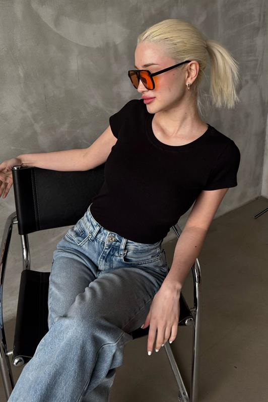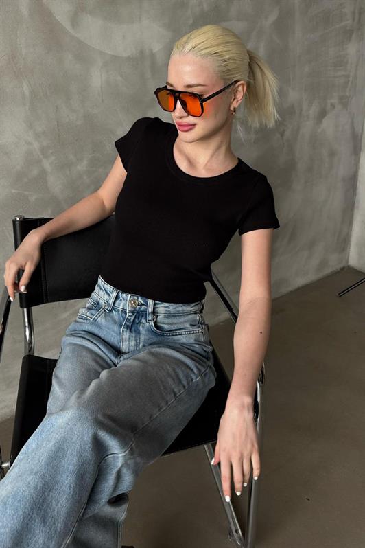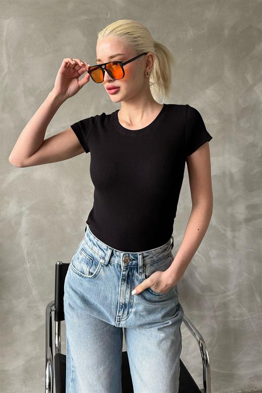 MDX Black Wide Neck Ribbed Basic Women's T-shirt Mg2293 - Oviedo