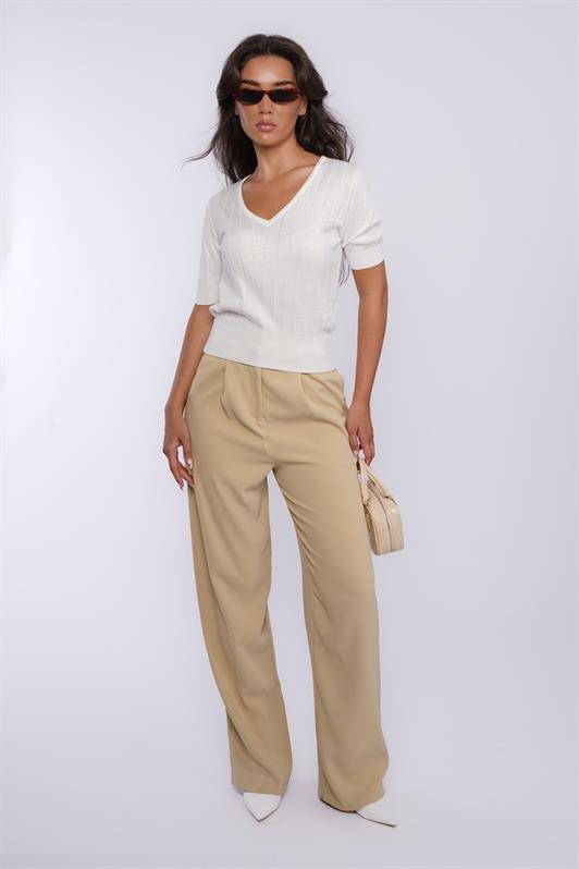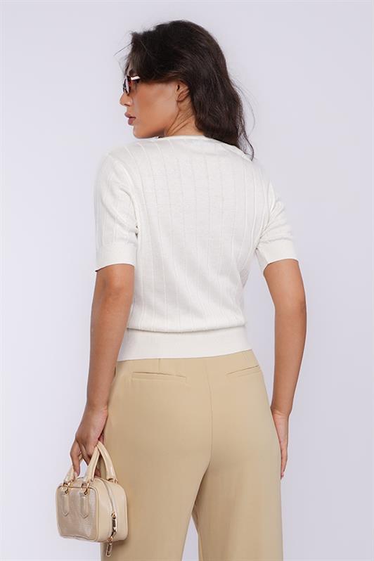 MDX Ekru V Yaka Örgülü Kadın Triko Tişört Mg2369 - Ilford