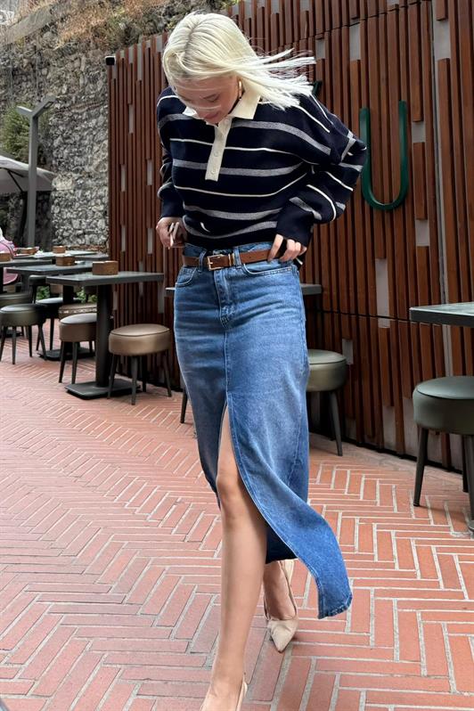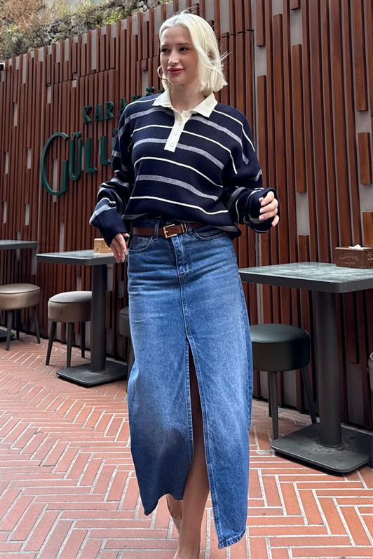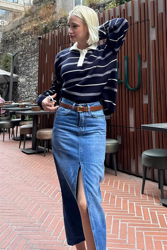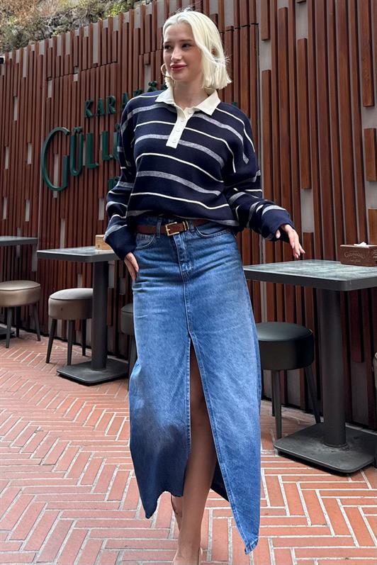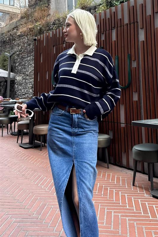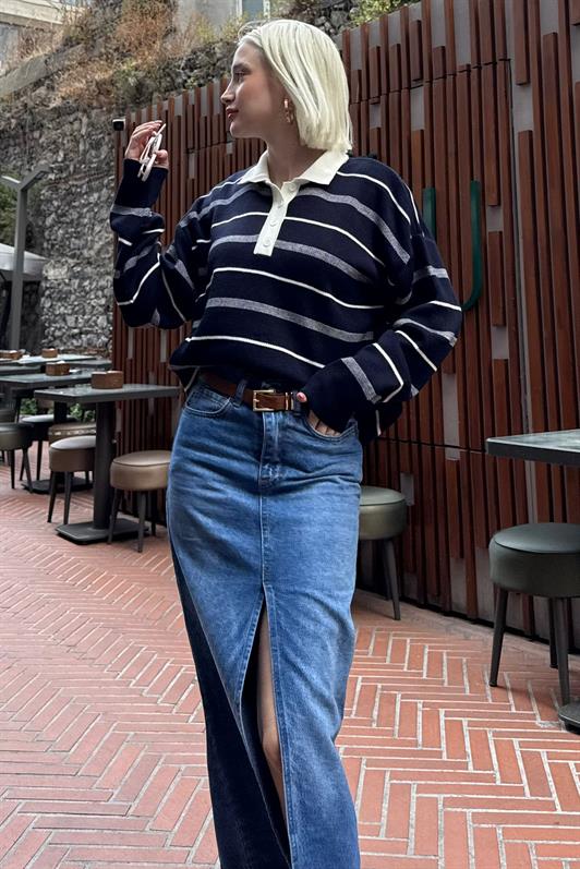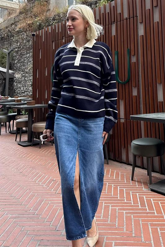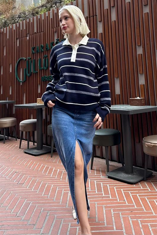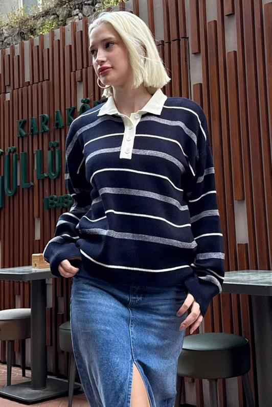 MDX Lacivert Çizgili Polo Yaka Kadın Kazak Mg2476 - Ixtapaluca