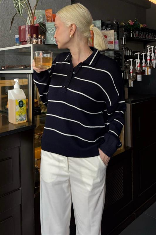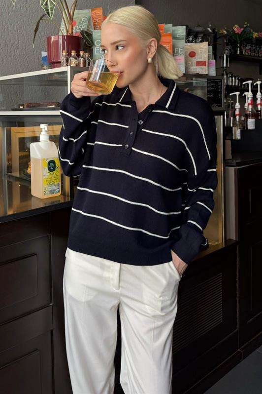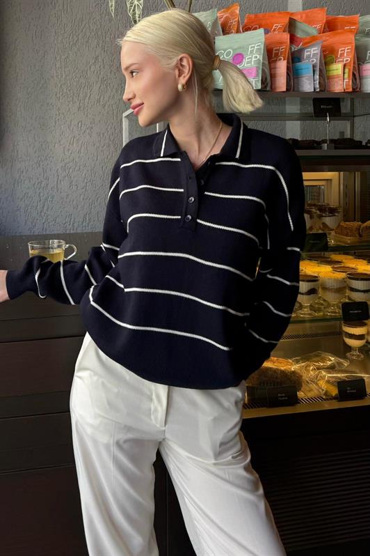 MDX Lacivert Çizgili Polo Yaka Kadın Triko Kazak MG2470 - Fedosiia