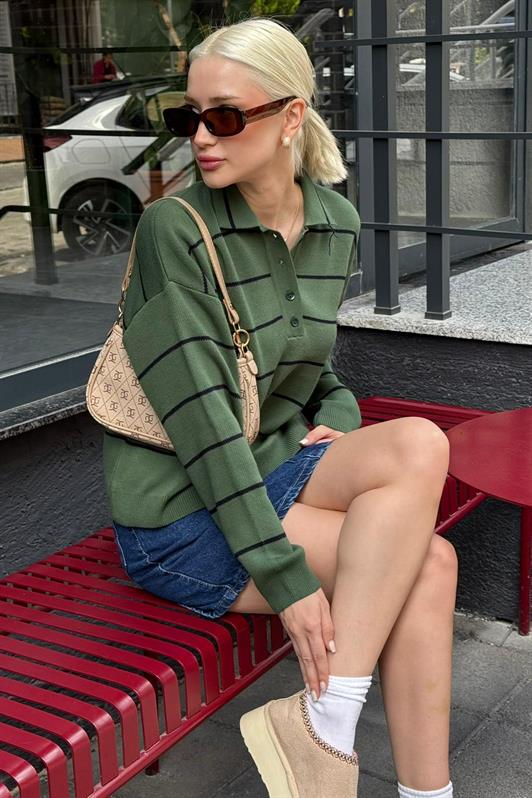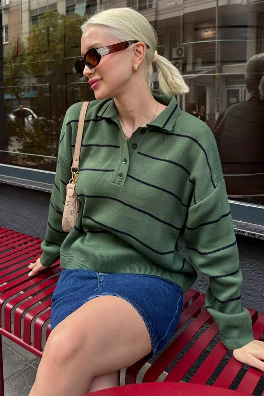 MDX Melanj Yeşili Çizgili Polo Yaka Kadın Triko Kazak MG2470 - Paraíso