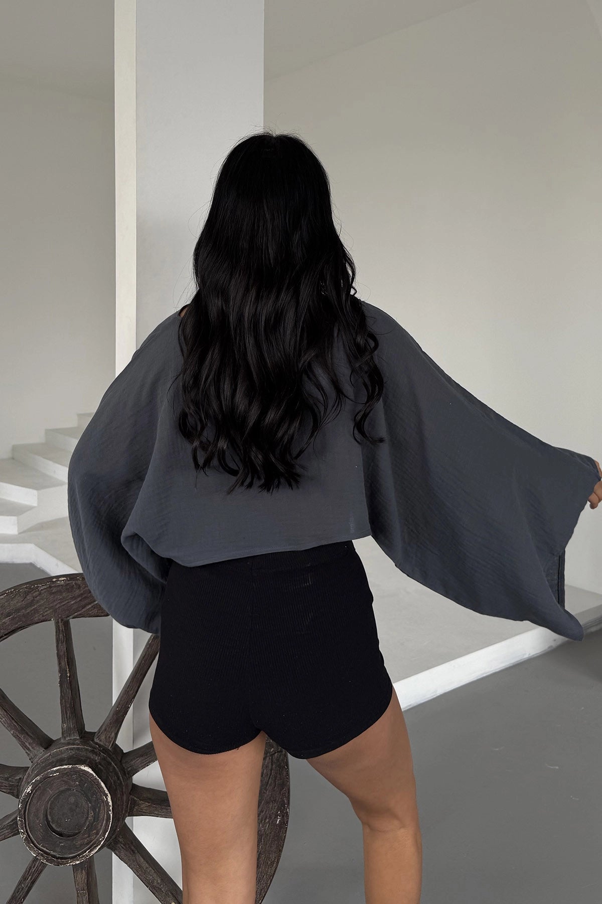 Anthracite Wide Neck Batwing Sleeve Muslin Fabric Linen Blouse