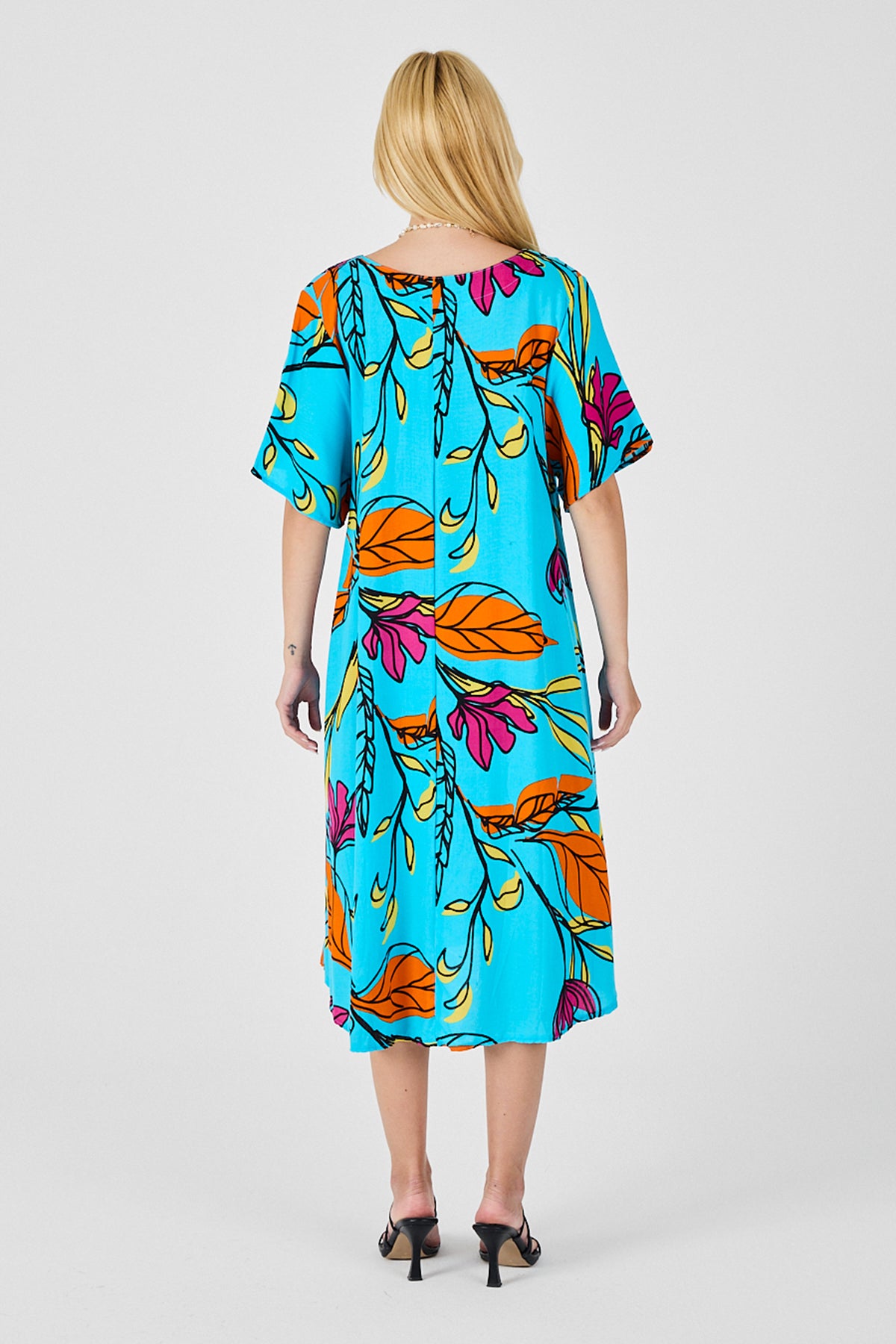 Baby Blue Leaf Pattern U Neck Short Sleeve Midi Dress BCVL-254011 - Winter Springs