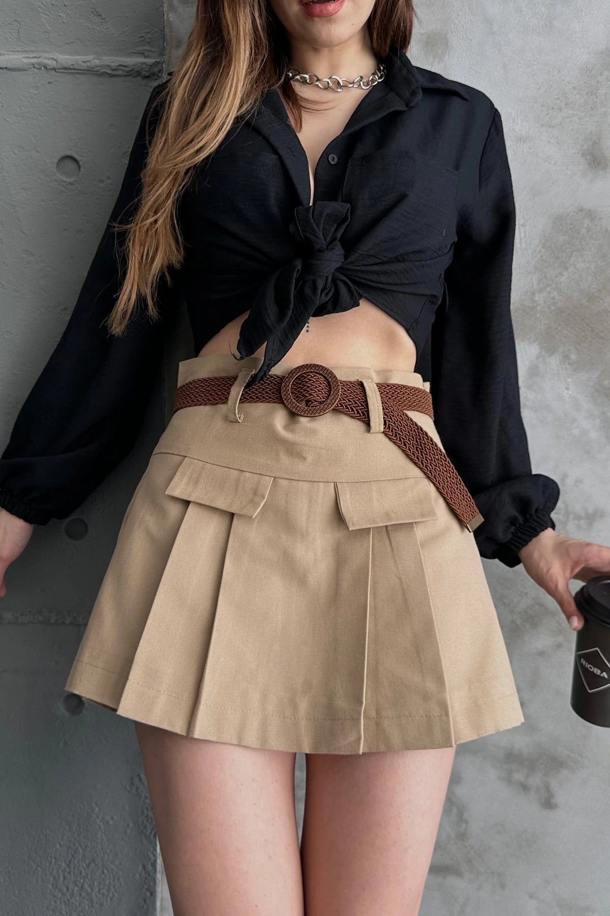 Beige Belted Detailed Gabardine Shorts Skirt BCDF-247708 - Bitterfeld