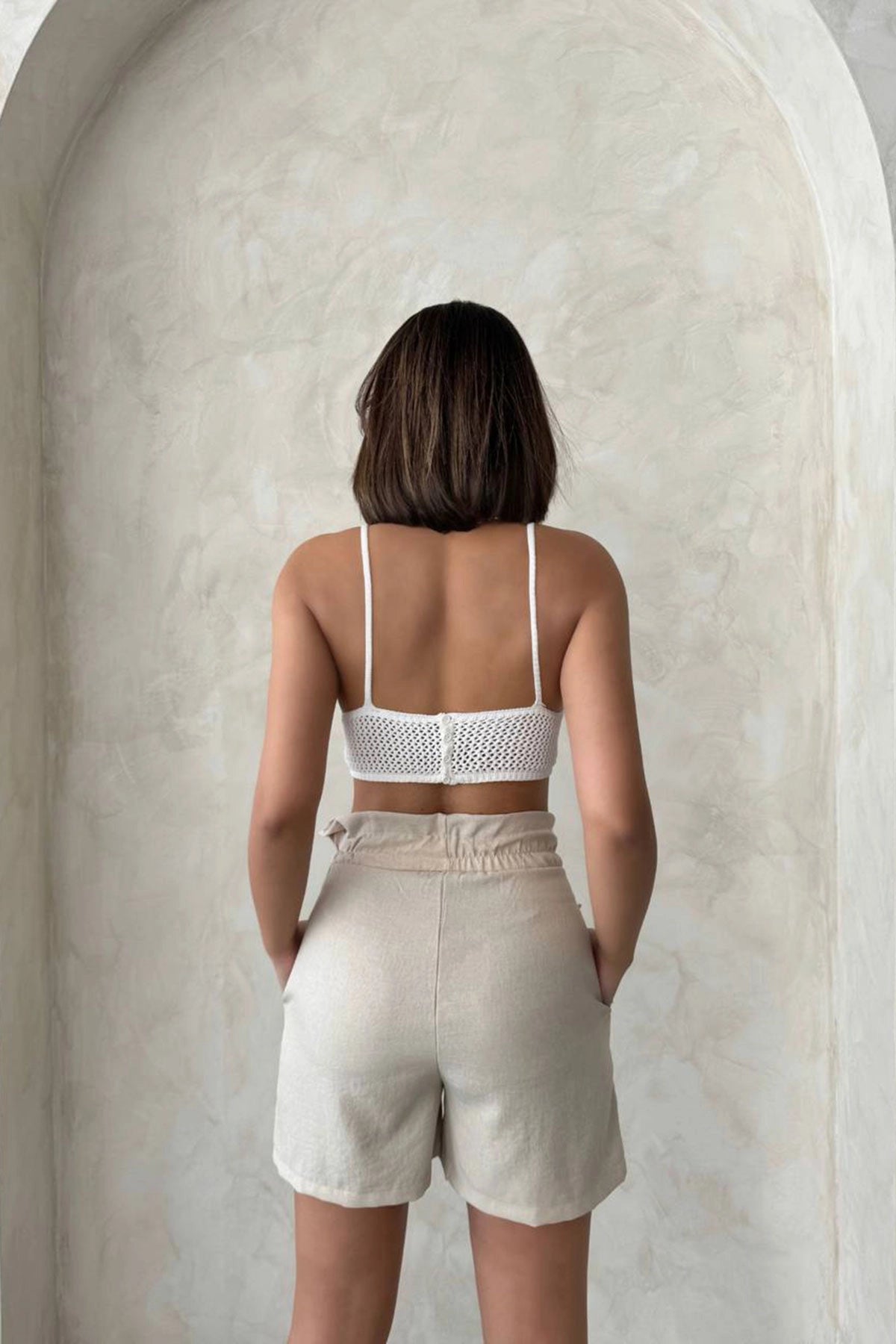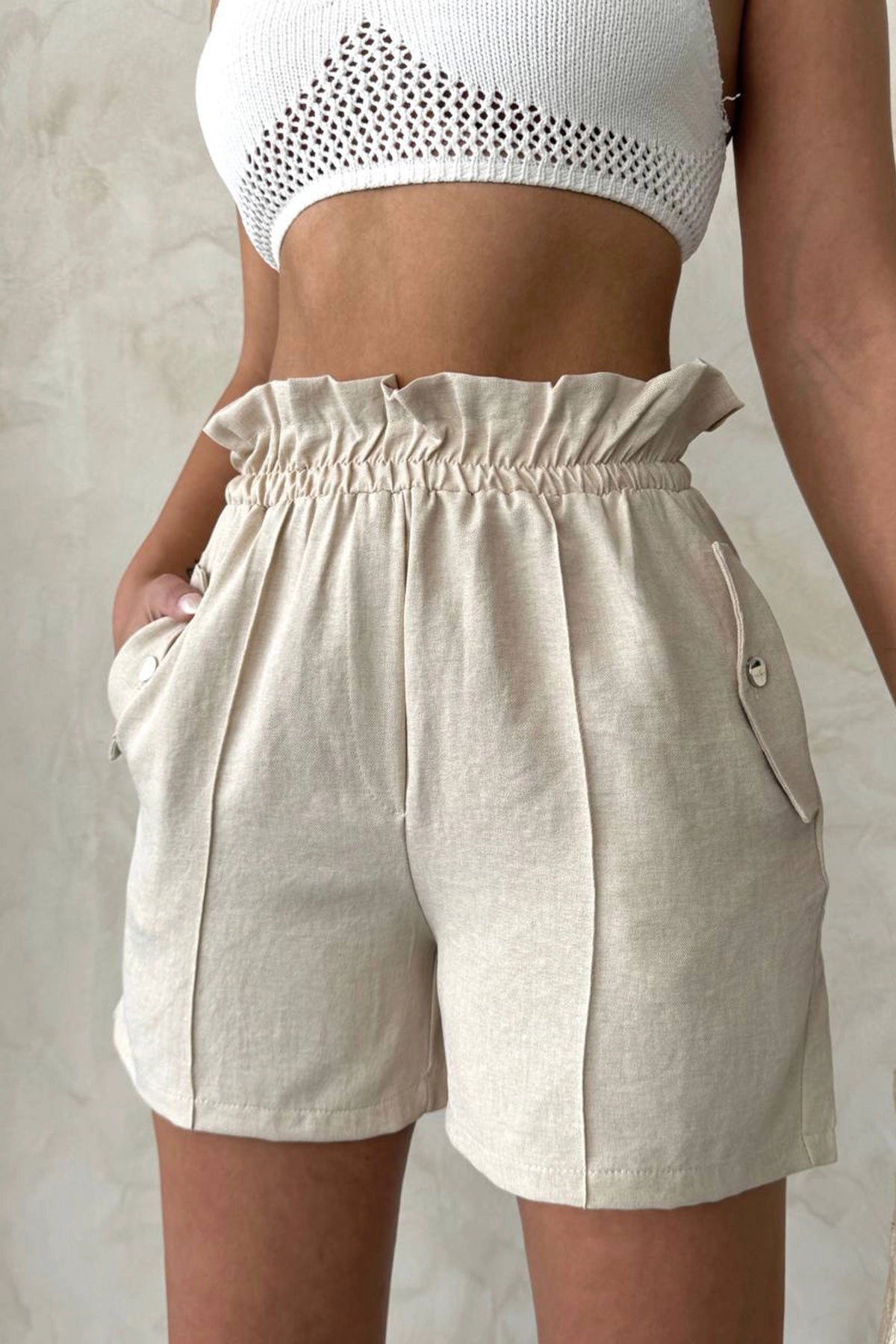 Beige Double Pocket High Waist Ruffled Front Linen Shorts BCHN-2525834 - Kramatorsk