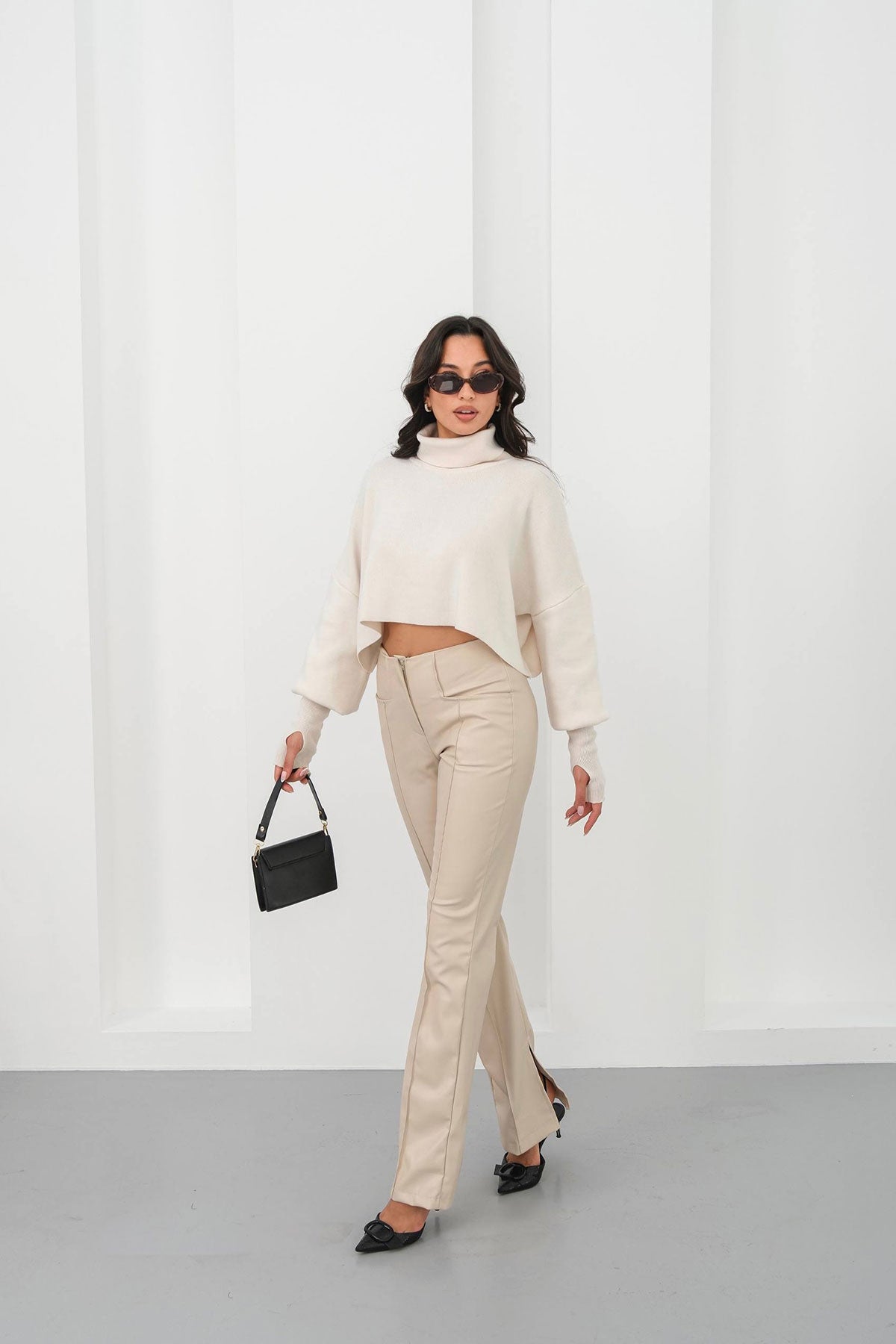 Beige High Waist Slit Faux Leather Pants BCHN-25265099 - Chatham
