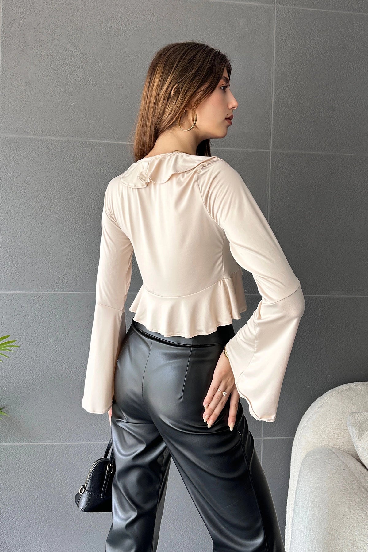 Beige Ruffle Detailed Front Tied Crop Blouse