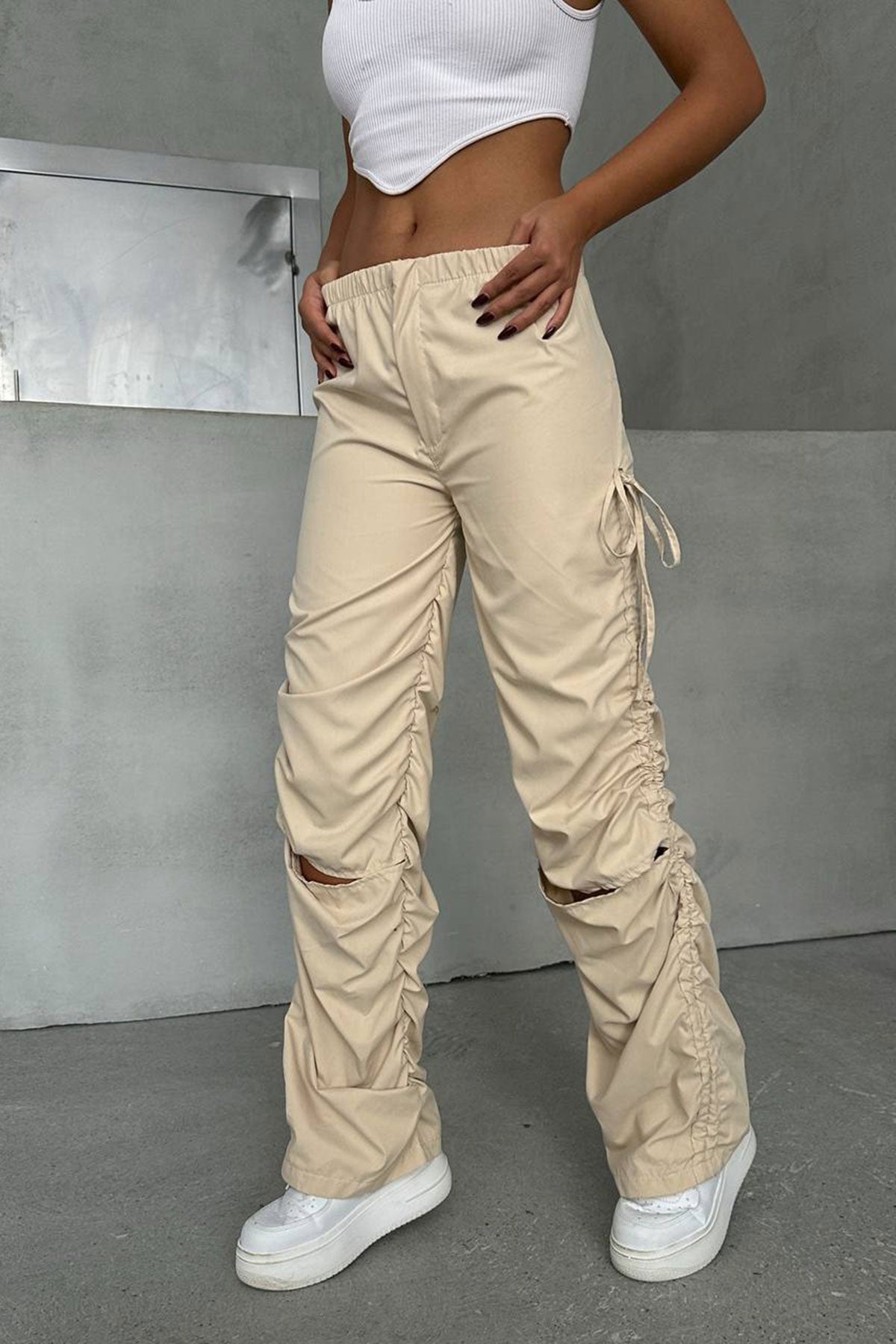 Beige Series Slit Parachute Fabric Design Jogger Pants