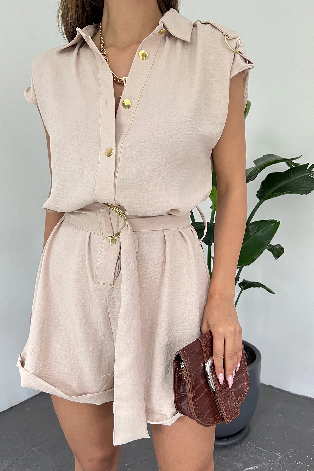 Beige Shoulder Epaulet Belted Aerobin Woven Shorts Jumpsuit BCDF-238802 - Steinfurt