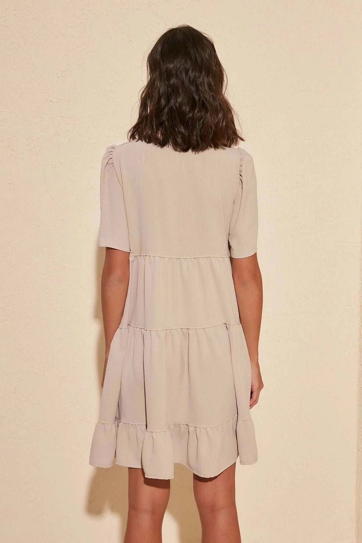 Our New Beige Color Ruffle Short Sleeve A-Line Midi Dress is a perfect choice for both office and daily wear with its elegant and modern style. This dress offers you a unique experience by combining elegance and comfort. The fabric content of our dress is made of 60% polyester and 40% cotton. This special blend provides durability and softness while combining breathability and comfort. This way, you can wear the dress comfortably for a long time. Beige color is a timeless and stylish choice. This warm tone gives you a sophisticated look in any situation and also fits perfectly into your daily life. Beige stands out for its compatibility with every season and style. The cut of our dress features short sleeves and an A-line design. This cut offers a gentle silhouette that delicately hugs the body and creates a feminine look. The midi length extends up to the knee, so you can easily wear it in formal settings as well as daily activities. One of the standout details of the dress is the ruffled hem section. This romantic and lively detail adds lightness and charm to the dress while reflecting a feminine style. Ruffles emphasize the flow and movement of the dress, so you can attract attention with every step. This Beige Color Ruffle Short Sleeve A-Line Midi Dress offers a professional style in the workplace while also providing a chic look that you can easily wear in daily life. This dress, which impresses with both fabric quality and design, is poised to become one of the indispensable pieces in your wardrobe.