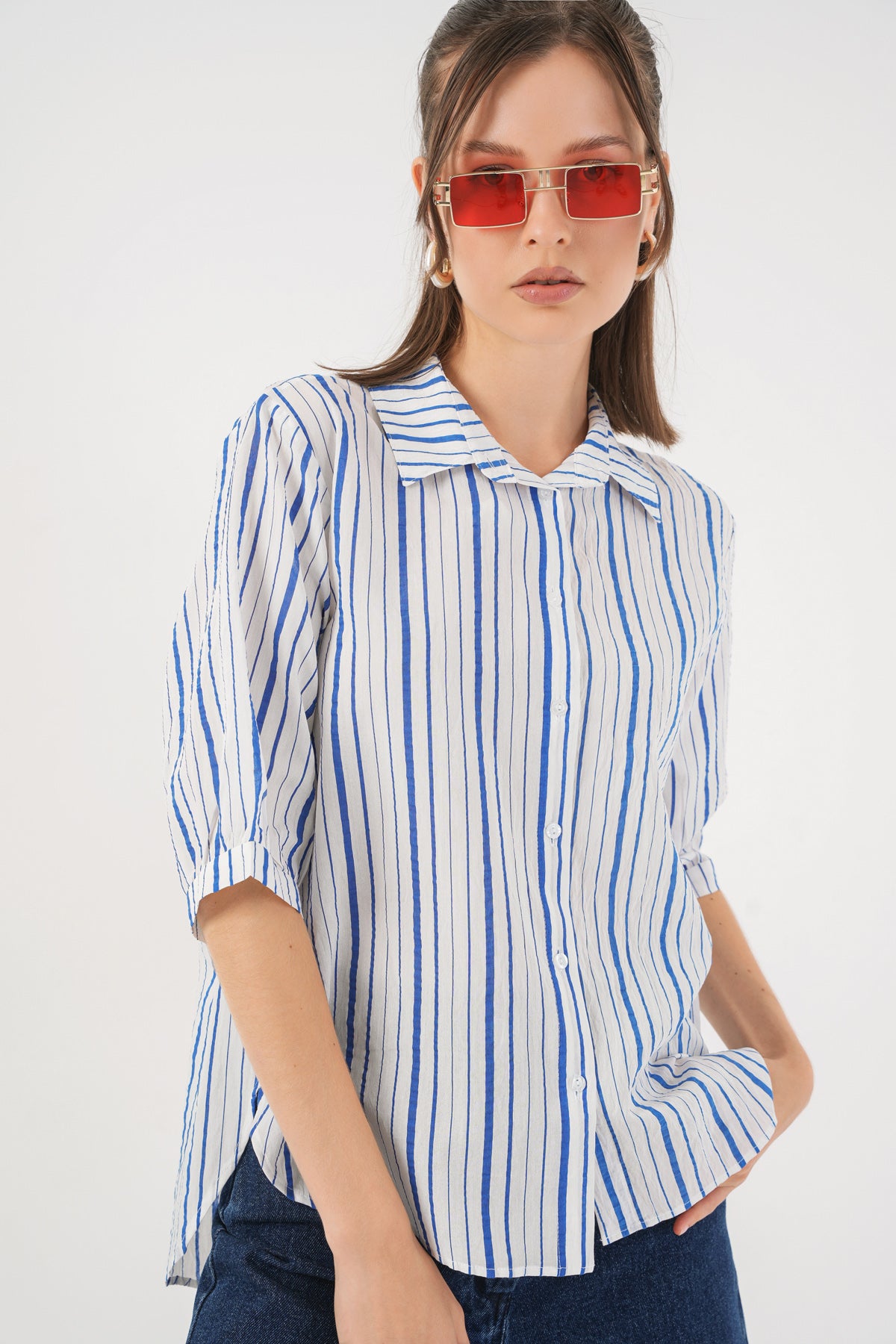 BGD Women Woman Striped Short Sleeve Shirt 20345 - Blue - Chilliwack