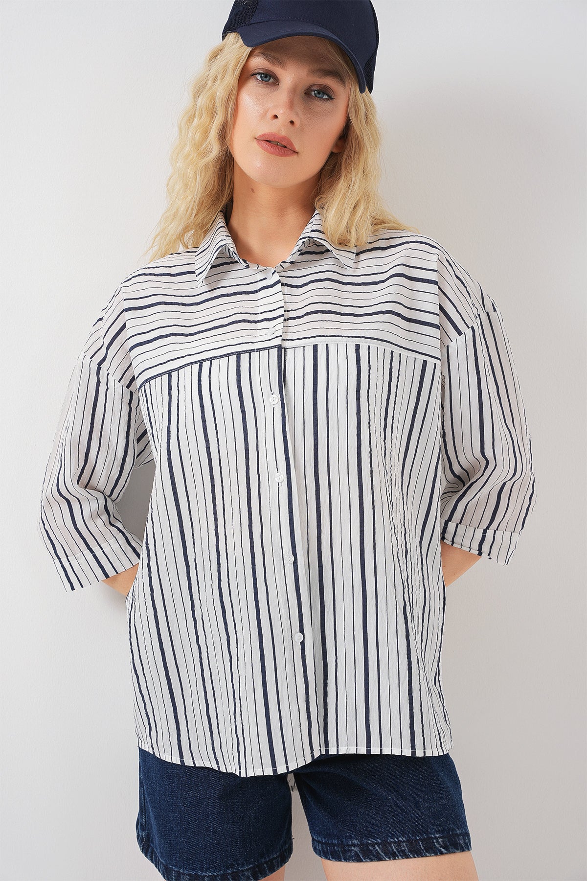BGD Women Women's Striped Short Sleeve Shirt 20344 - Navy Blue - Azzano