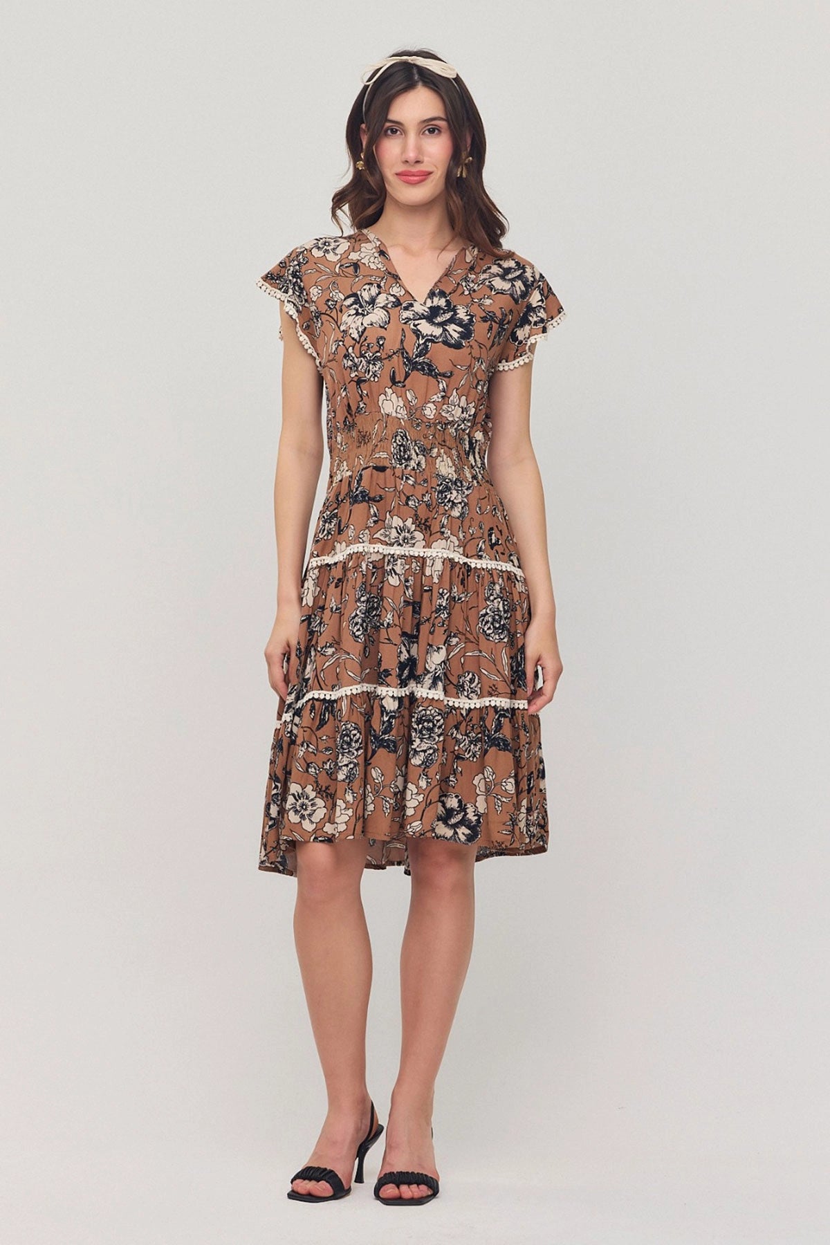 Biscuit V Neck Ruffled Flower Patterned Summer Viscon Dress BCVL-25V054 - Cernusco sul Naviglio