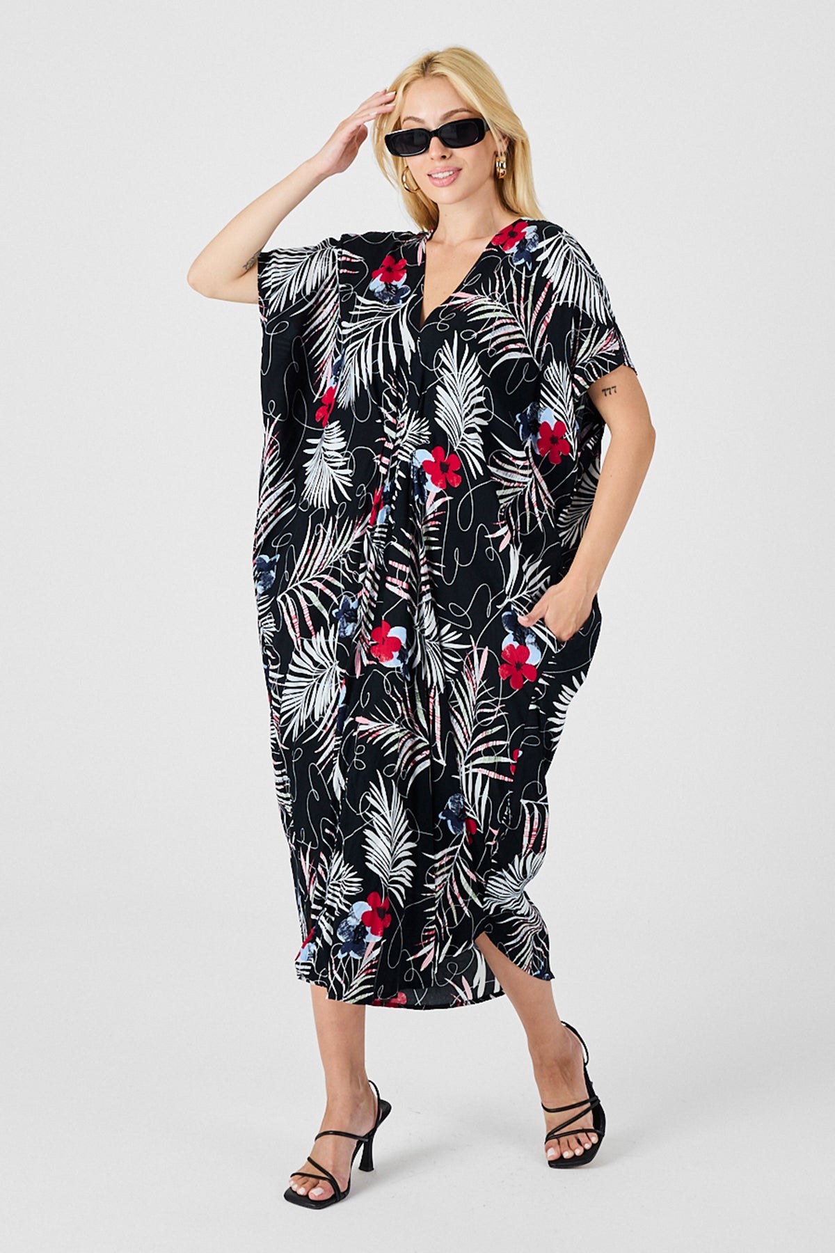 Black and White Patterned V-Neck Loose Fit Kaftan Dress