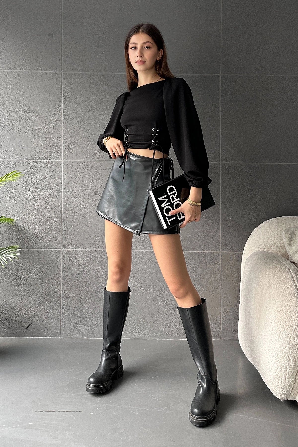 Black Bicycle Collar Balloon Sleeve Eyelet Detailed Crop Blouse