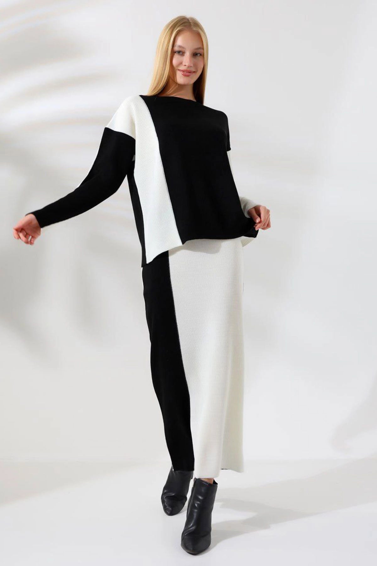 Black Bicycle Collar Color Block Sweater And Skirt 2 Piece Top Bottom Knit Set