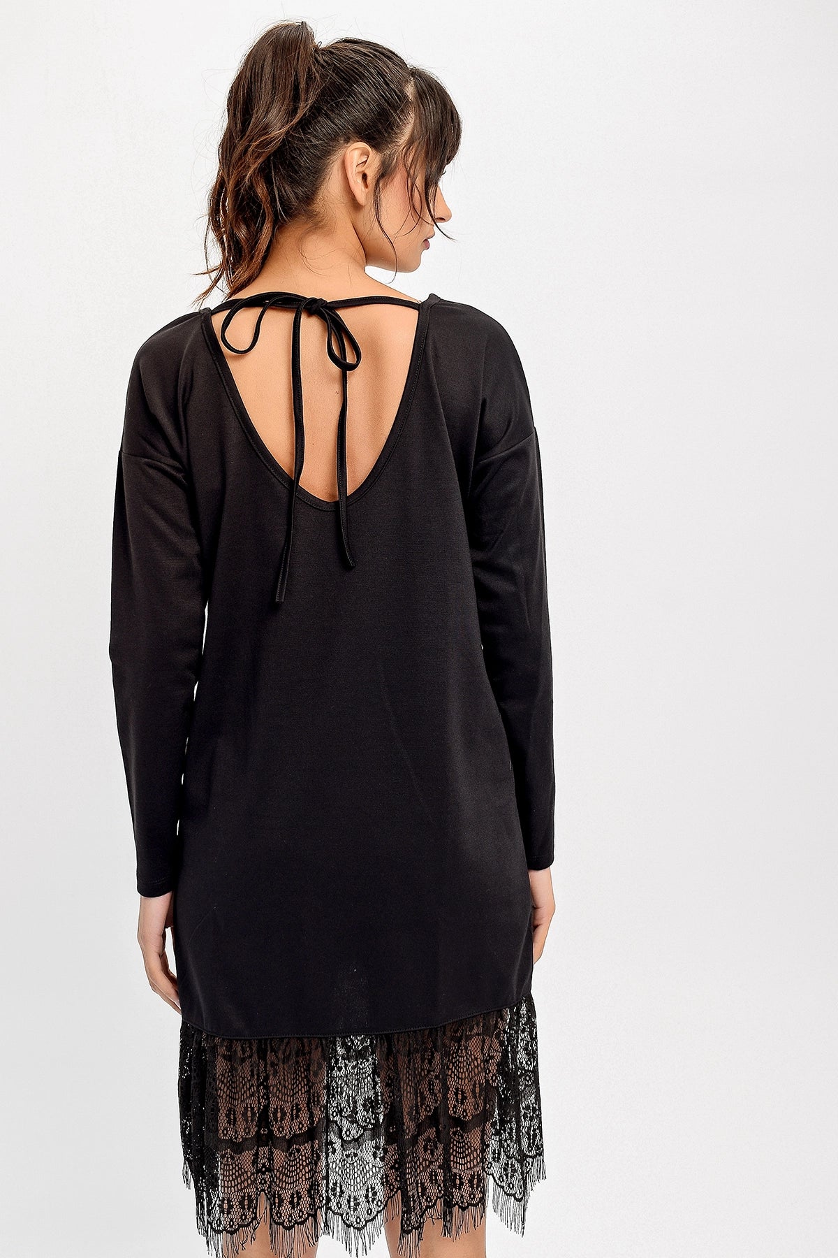 This elegant black dress is a perfect choice for those with a sophisticated style. Featuring a round neckline detail for a modern look and lace details for a feminine touch. With its long-sleeved design, the dress is ideal for both office and daily wear. The midi length of the dress reaches up to the knees, providing a stylish look for professional settings and allowing comfortable movement for your daily activities. The fabric content is a blend of 95% polyester and 5% elastane, offering a soft and comfortable texture. Polyester provides advantages such as durability and resistance to wrinkles, while elastane offers flexibility and freedom of movement. The black color ensures the dress remains a classic and timeless choice, complementing all skin tones and easily combinable with other colors. You can accessorize this dress to match your desired style and occasion. Carefully designed in terms of fit and style, the round neckline creates an elegant silhouette, and the lace details are a perfect touch to highlight your elegance. The midi length offers a classic and stylish look, while the long-sleeved design adds a sophisticated touch to the dress. This dress is a great choice for those looking to achieve a professional look in office settings and also ideal for those seeking a stylish and comfortable style for daily activities. In short, this dress is a versatile option that will provide you with elegance and comfort in any situation.