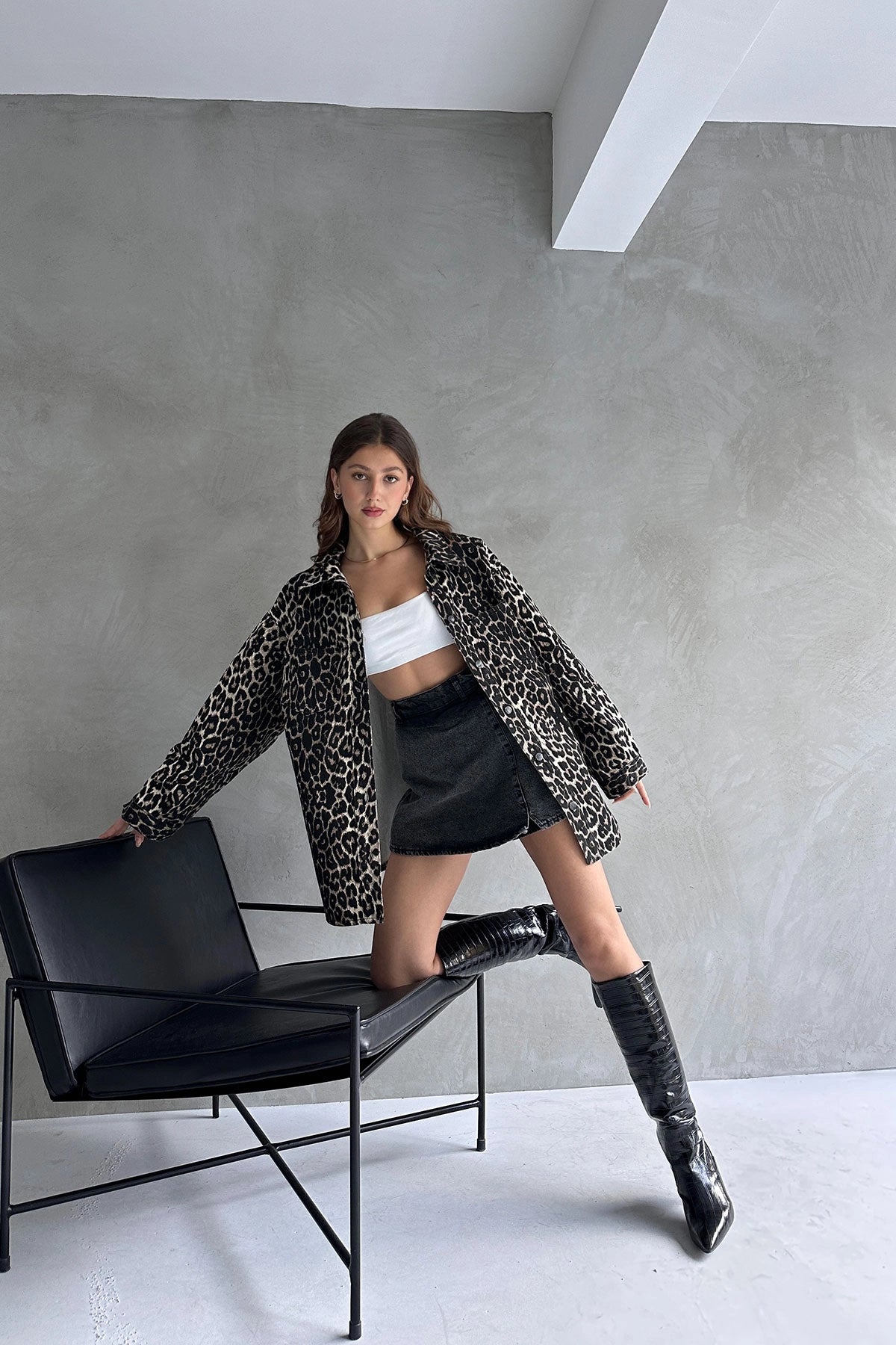 Black-Coffee Leopard Print Double Pocket Oversized Denim Shirt Jacket BCDF-245417 - Bridgwater