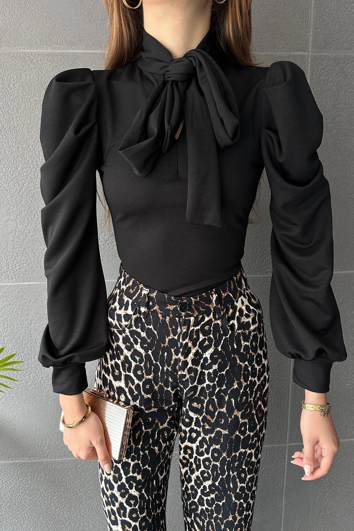 Black Collar Lace-Up Sleeve Cuff Detailed Blouse