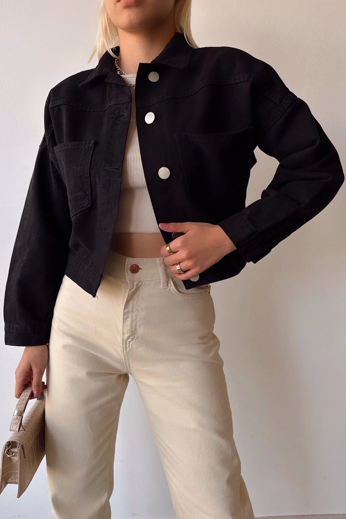 Black Double Pocket Crop Washed Denim Jacket